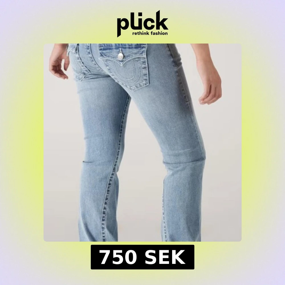 Säljer ett par ljusblå jeans från True Religion med ikoniska stora bakfickor och vita kontrastsömmar. Modellen är joey w26 och säljer för att jsg sparar pengar❤️