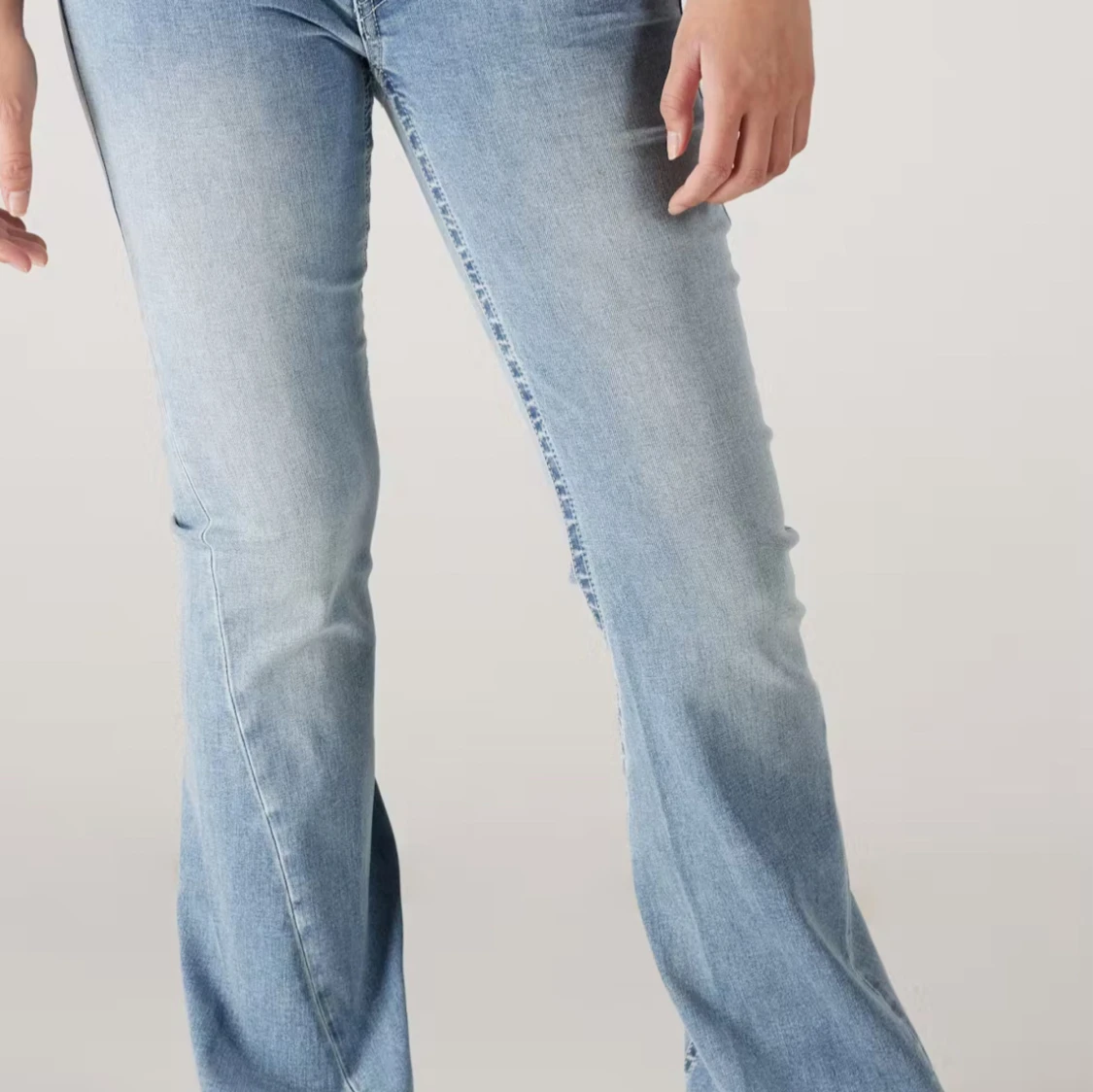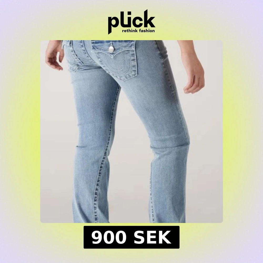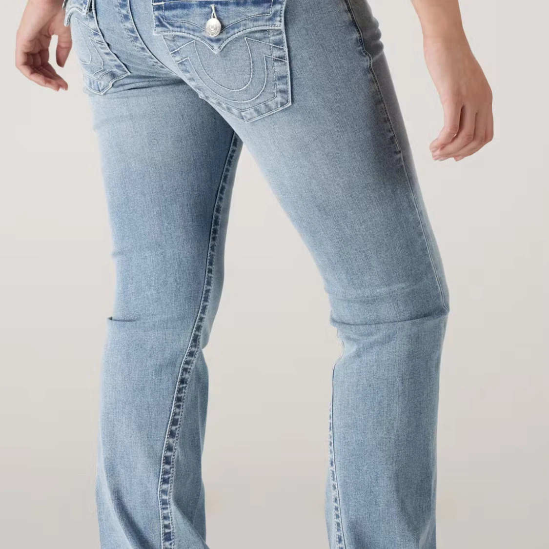 Snygga ljusblå jeans från True Religion med bootcut passform och ikoniska stora bakfickor med vit söm och knapp. Jeansen har klassisk femficksdesign och är tillverkade i mjukt denimtyg som ger en avslappnad vibe.