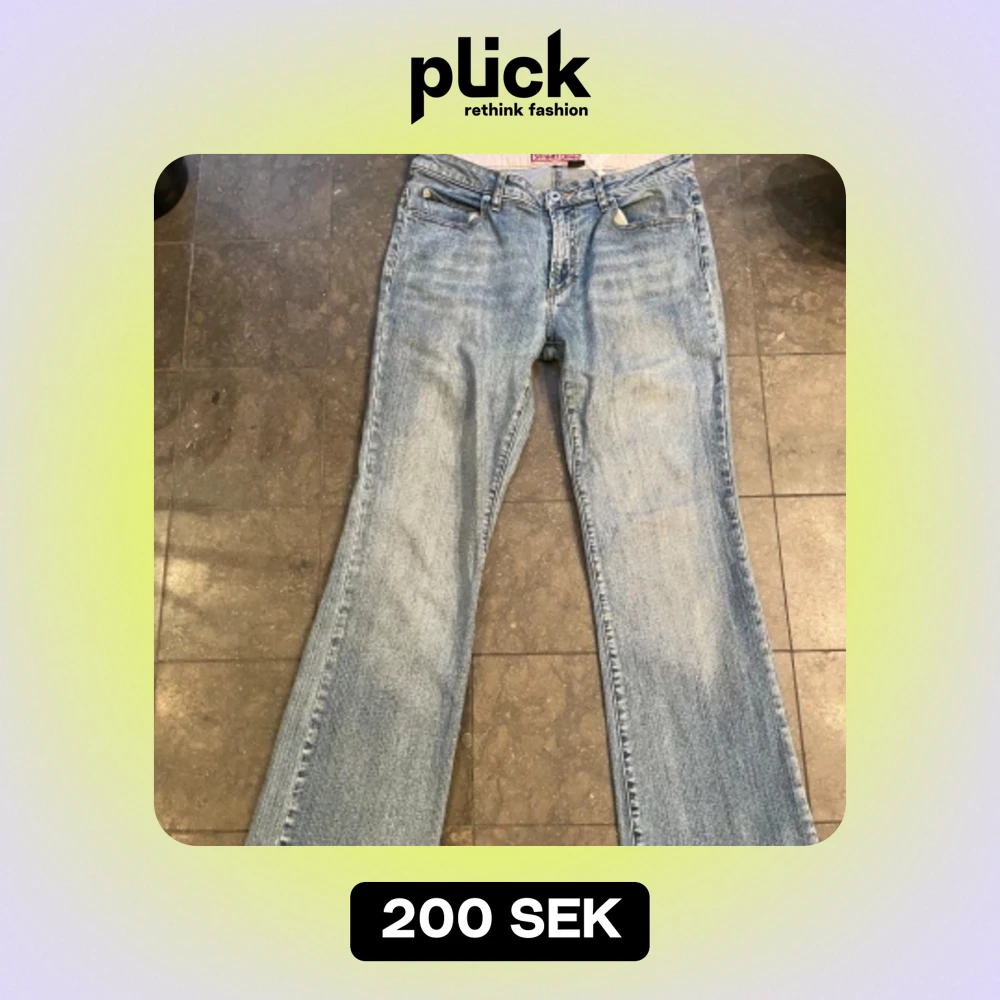 Säljer ett par klassiska blå bootcut jeans i en ljus tvätt. De har en snygg och avslappnad stil med en bekväm passform.