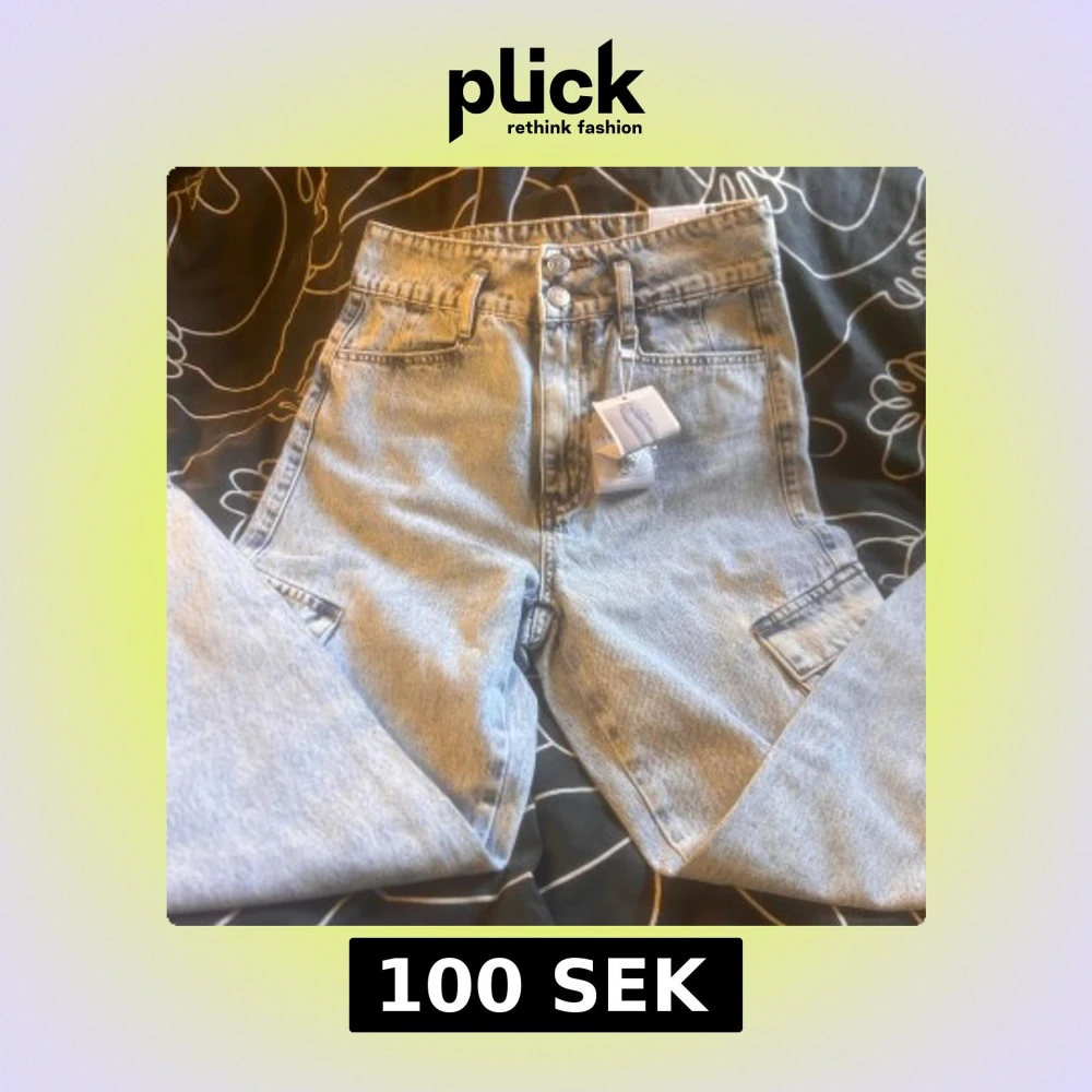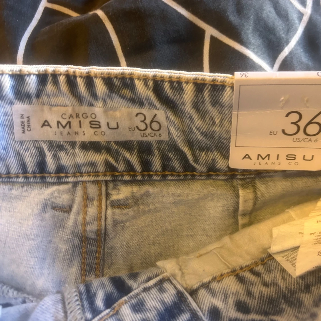 Snygga ljusblå cargo jeans från Amisu i storlek 36. Byxorna har hög midja, raka ben och coola cargofickor på sidorna. Tillverkade i klassiskt denim med dubbla knappar i midjan. Perfekta för en avslappnad streetstyle-look.
