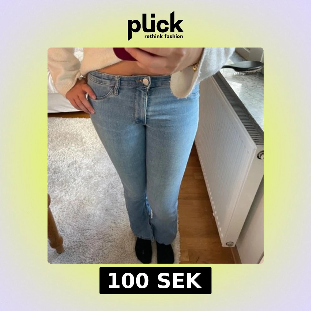 Säljer ett par ljusblå flare jeans från H&M med låg midja. Jeansen har klassisk femficksdesign och är tillverkade i mjukt denimtyg. Perfekta för dig som gillar en retro vibe och vill ha ett par snygga utsvängda jeans.