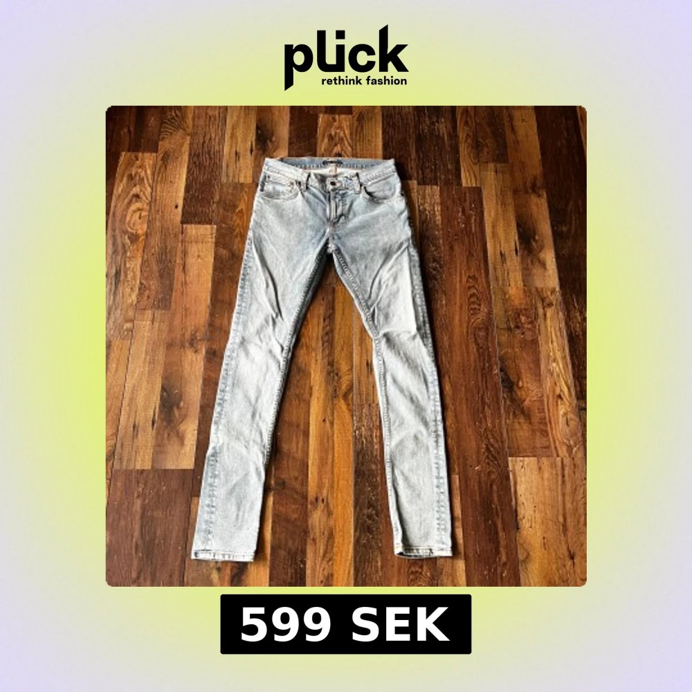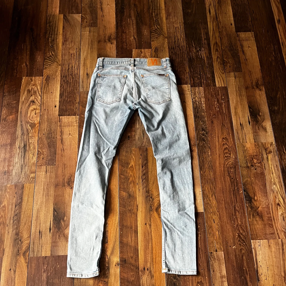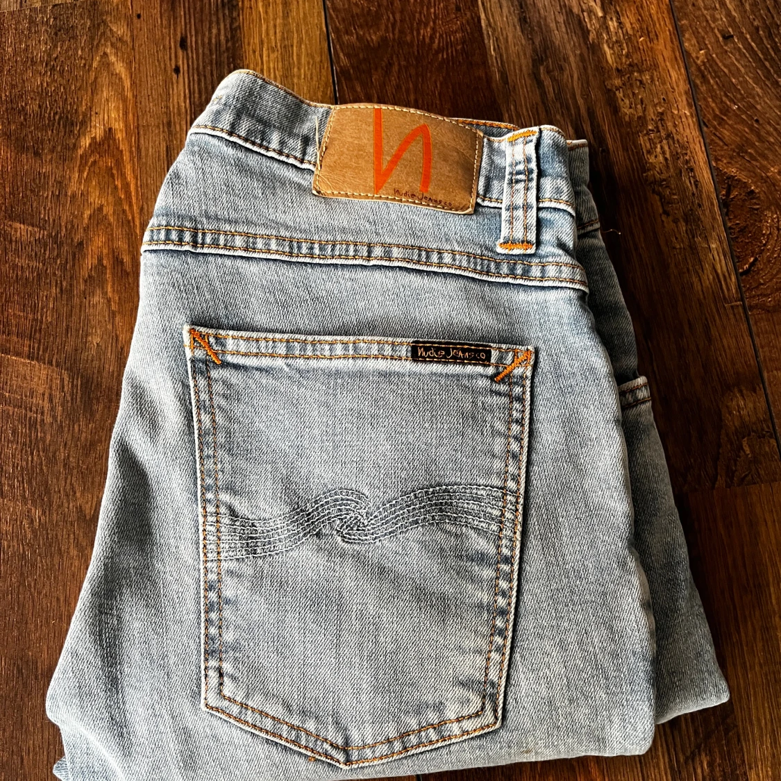 Säljer ett par ljusblå skinny jeans från Nudie Jeans med klassiska orange sömmar och vågig brodyr på bakfickan. Jeansen har fem fickor, normal passform i midjan och är tillverkade i mjukt bomullsjeansmaterial. Perfekta för en avslappnad och stilren look. Aldrig använda