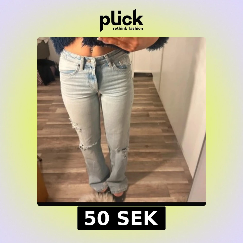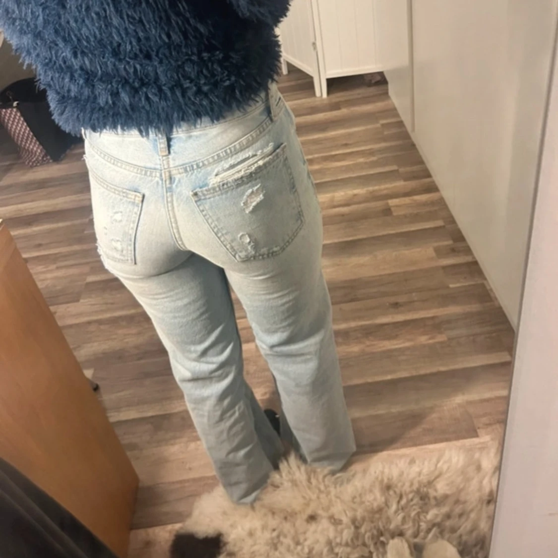Ljusblå jeans med hål. Olika slitningar både på framsidan och baksidan. Skit snygga men köpte fel storlek