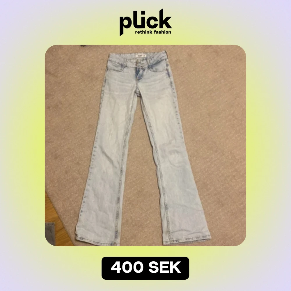 Säljer dessa ljusblå lågmidjade, utsvängda jeans från PULL&BEAR på grund av att de blivit försmå. Är väldigt sköna och är i bra skick!💕