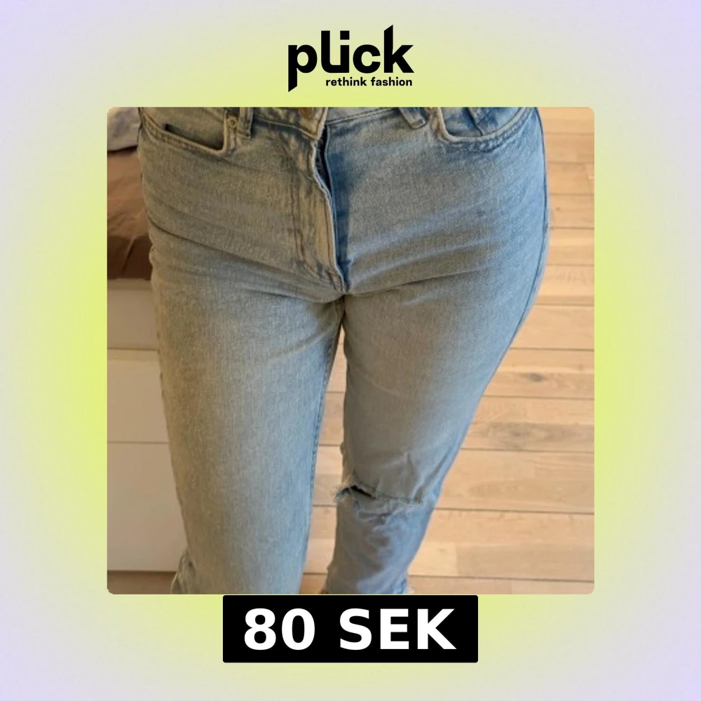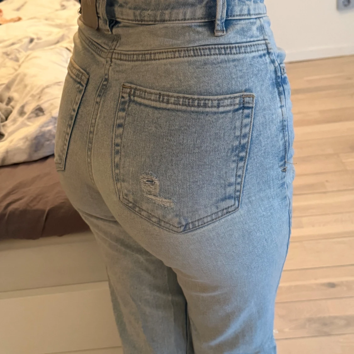 Säljer ett par ljusblå jeans från Pull & bear. Jeansen har en rak passform och snygga slitningar vid knä och bakficka. Perfekt för dig som gillar en avslappnad och trendig look.