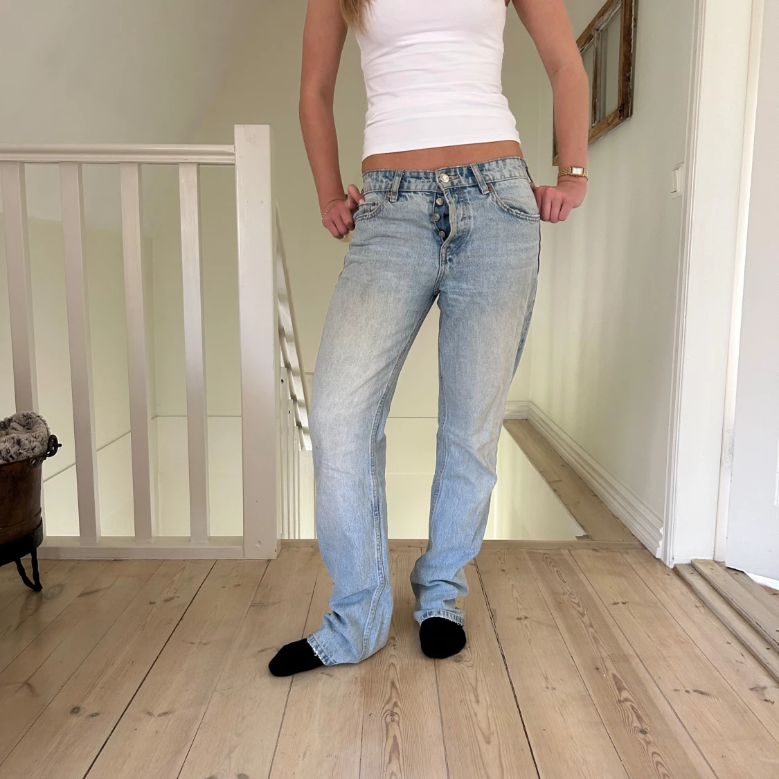 säljer dessa snygga jeans från zara som är lite mer raka i passformen, dem är fett coola och väldigt najs ljusblå färg som passar perfekt till sommaren🌸🌸🌸hör gärna av dig vid intresse!!!