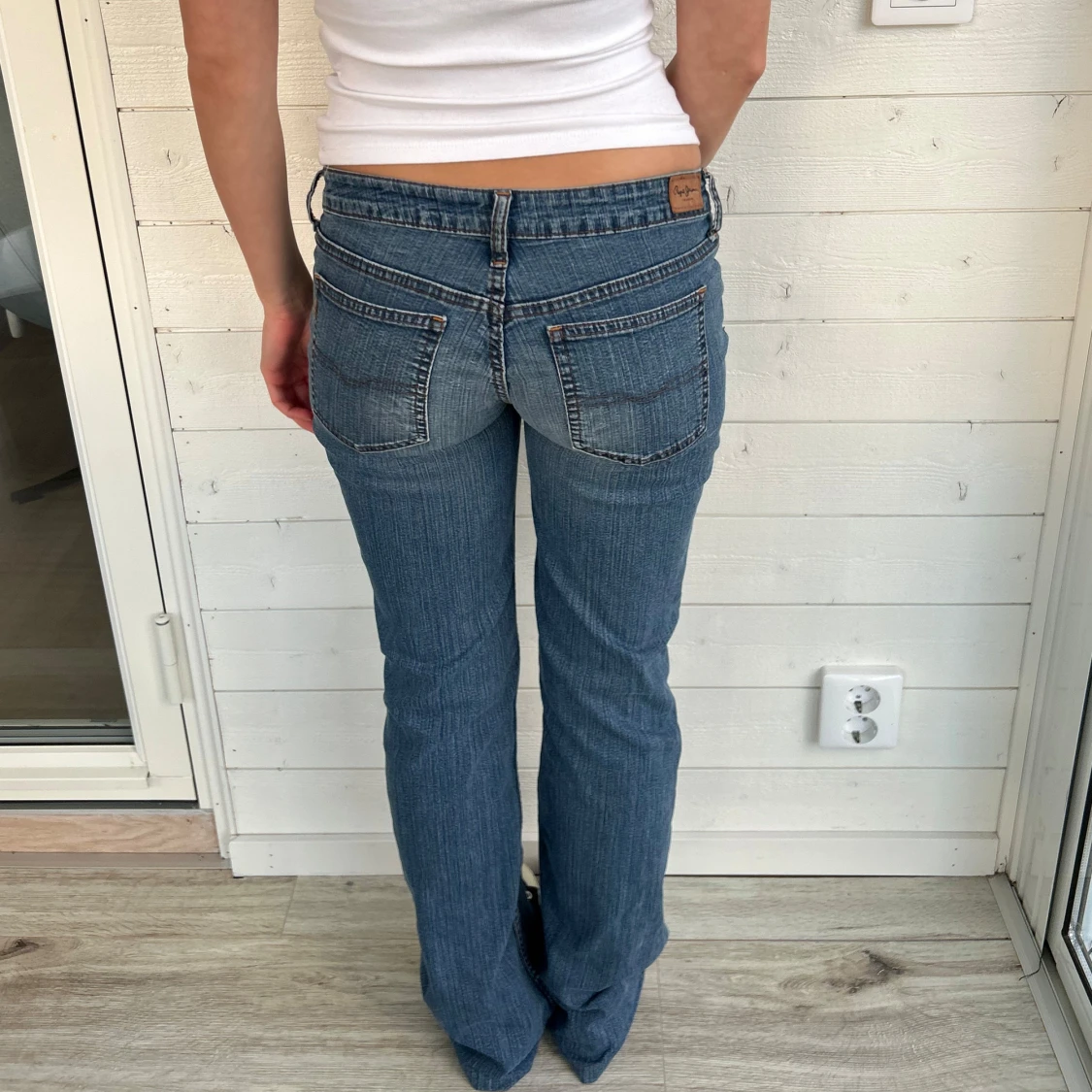 Blå lågmidjade bootcut jeans i storlek S. Midjemått: 38x2 cm innerbenslängden: 78 cm.