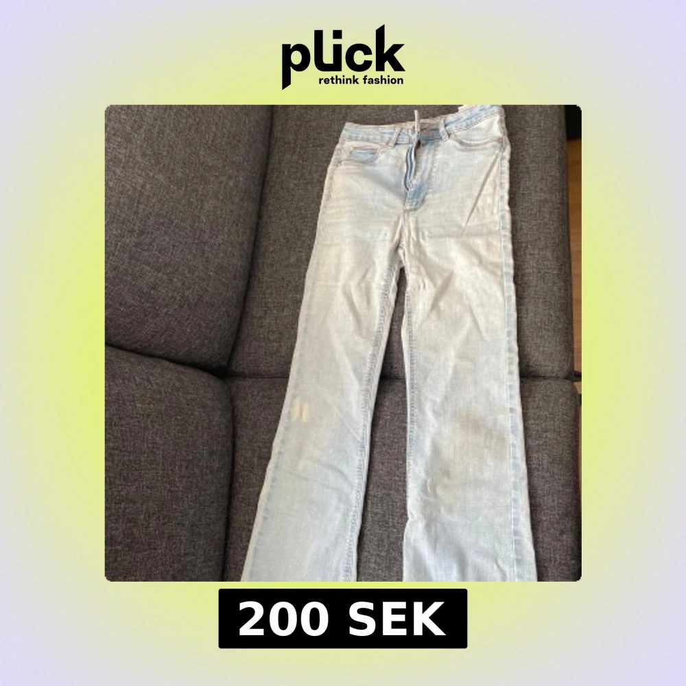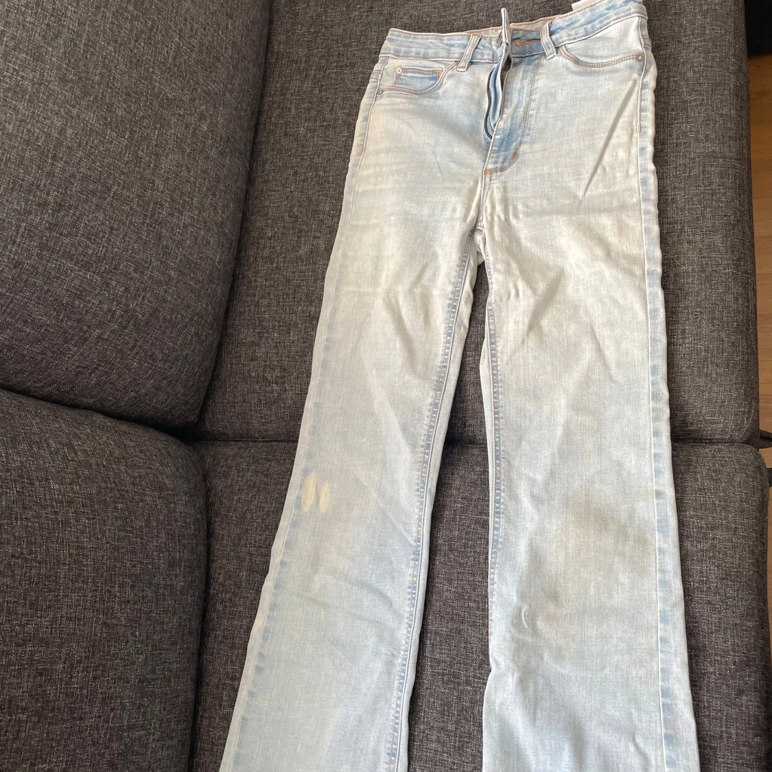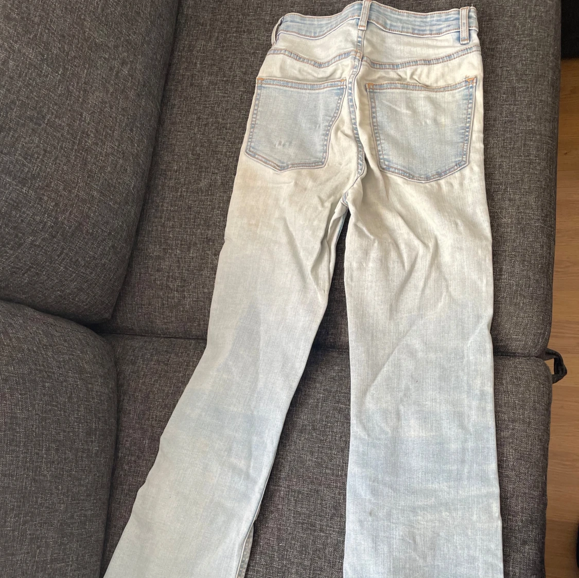 Säljer ett par ljusblå jeansbyxor med en klassisk femficksdesign. Jeansen är bootcut. De är blekta men kan se coolt ut.