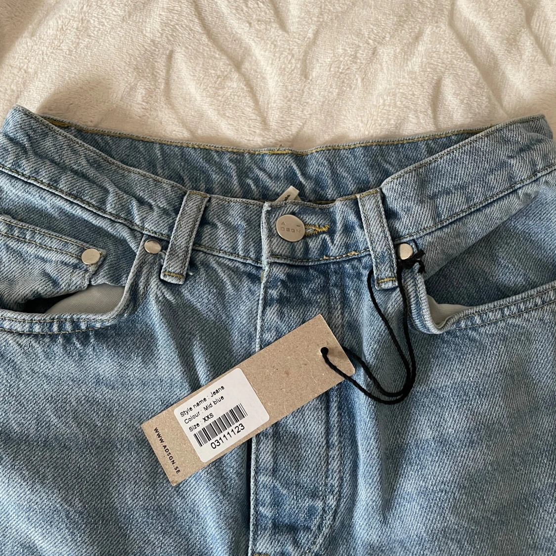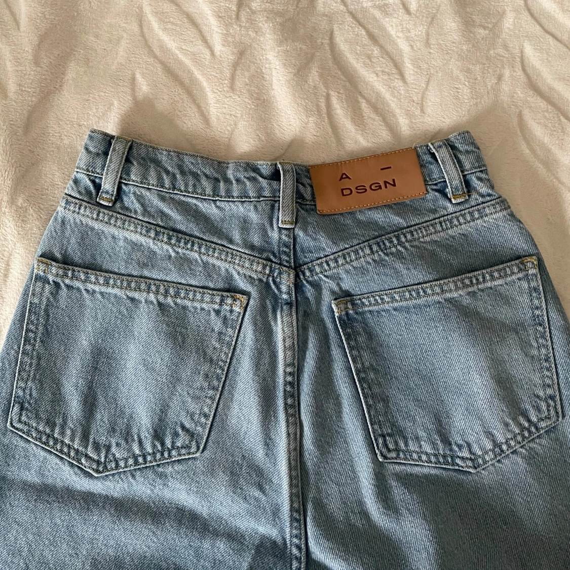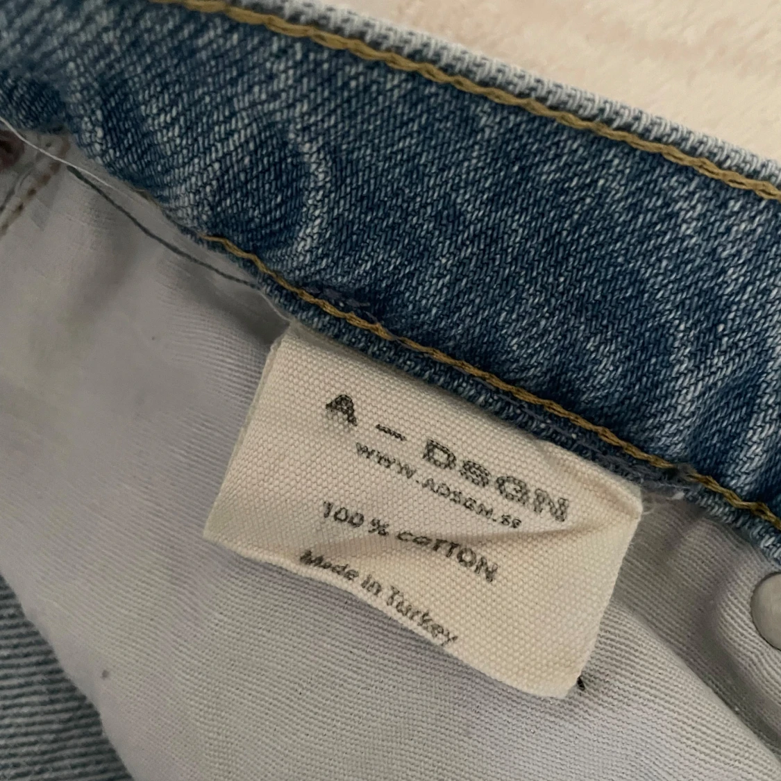 Säljer ett par snygga ljusblå jeans från A-DSGN i storlek XXS. De är tillverkade av 100% bomull och har en klassisk design med fem fickor och knappgylf. Perfekta för en avslappnad vardagslook! Nypris 700kr