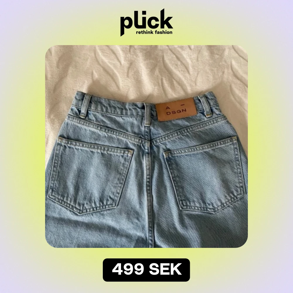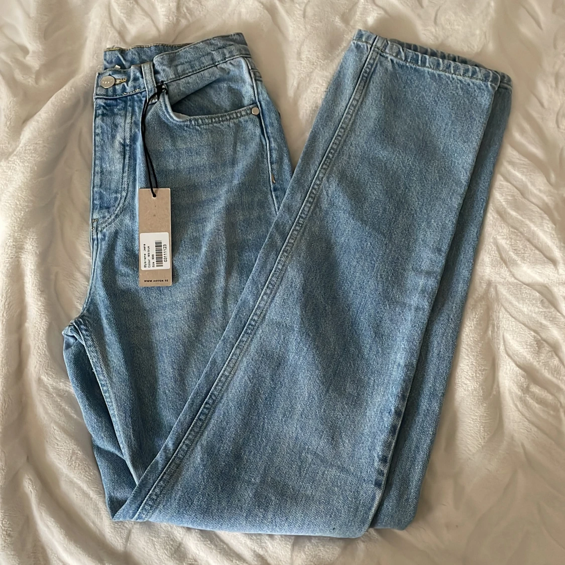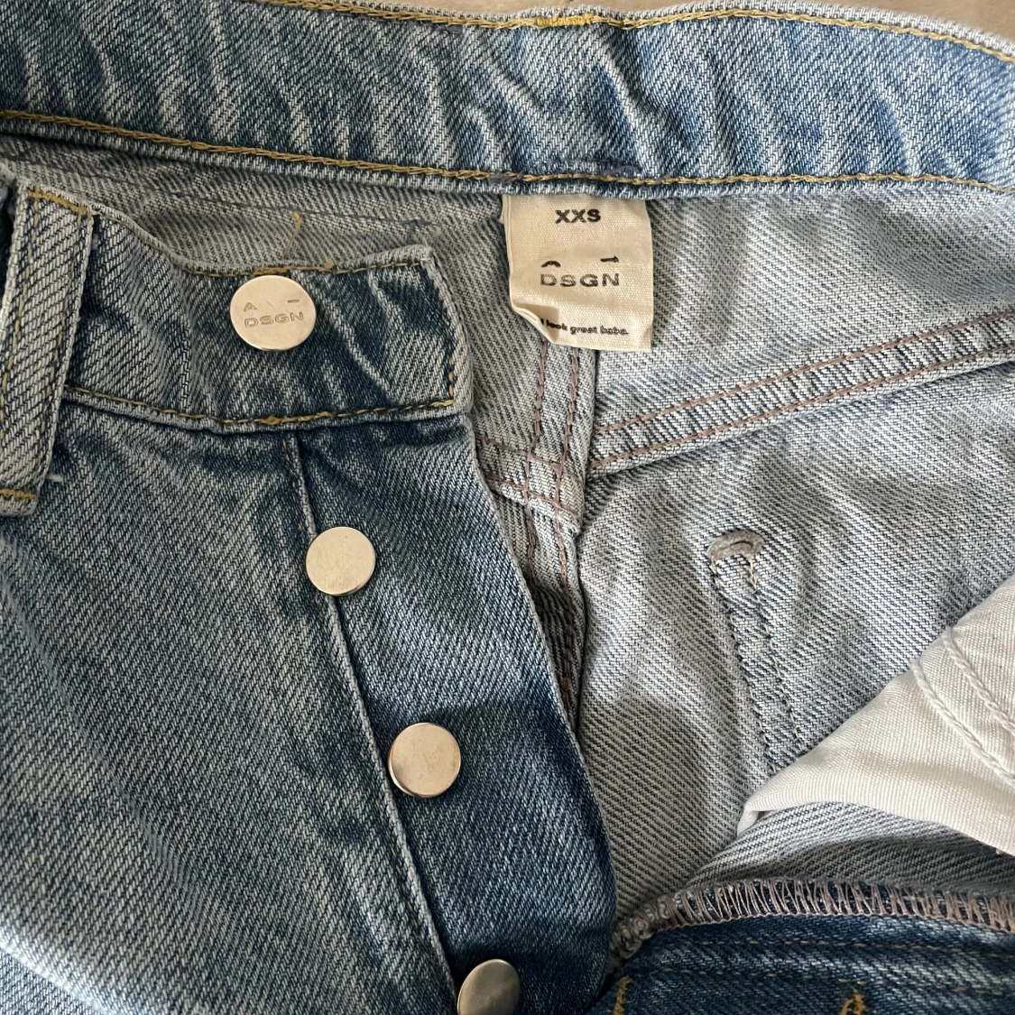 Säljer ett par snygga ljusblå jeans från A-DSGN i storlek XXS. De är tillverkade av 100% bomull och har en klassisk design med fem fickor och knappgylf. Perfekta för en avslappnad vardagslook! Nypris 700kr