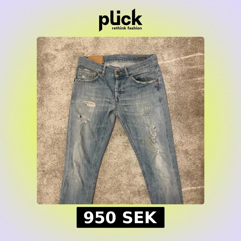 Snygga ljusblå jeans från Dondup med slitna detaljer och en klassisk femficksdesign. Märkeslogga syns på baksidan.Jag är cirka 1,80 och dom passar perfekt på mig.priset är långt ifrån hugget i sten,skriv för frågor?