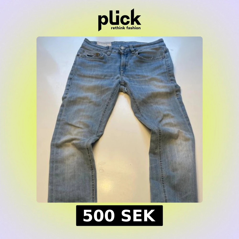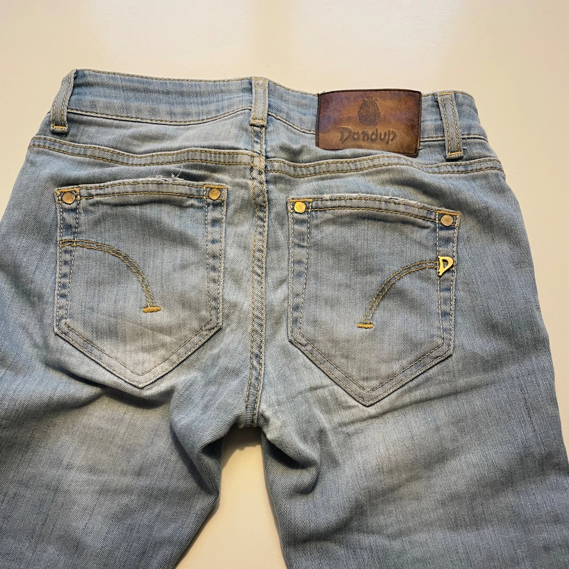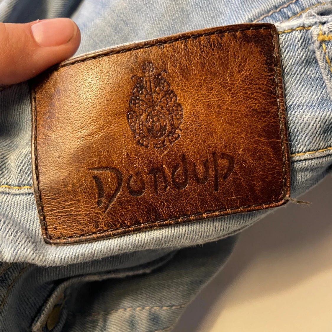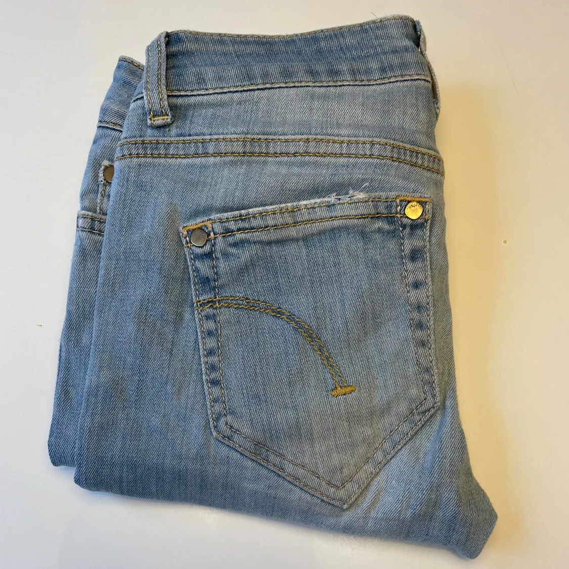 Snygga ljusblå jeans från Dondup med klassisk femficksdesign och guldfärgade nitar. Jeansen har raka ben och normal passform, med läderpatch bak i midjan och diskret broderi på bakfickorna. Perfekta för en avslappnad stil.