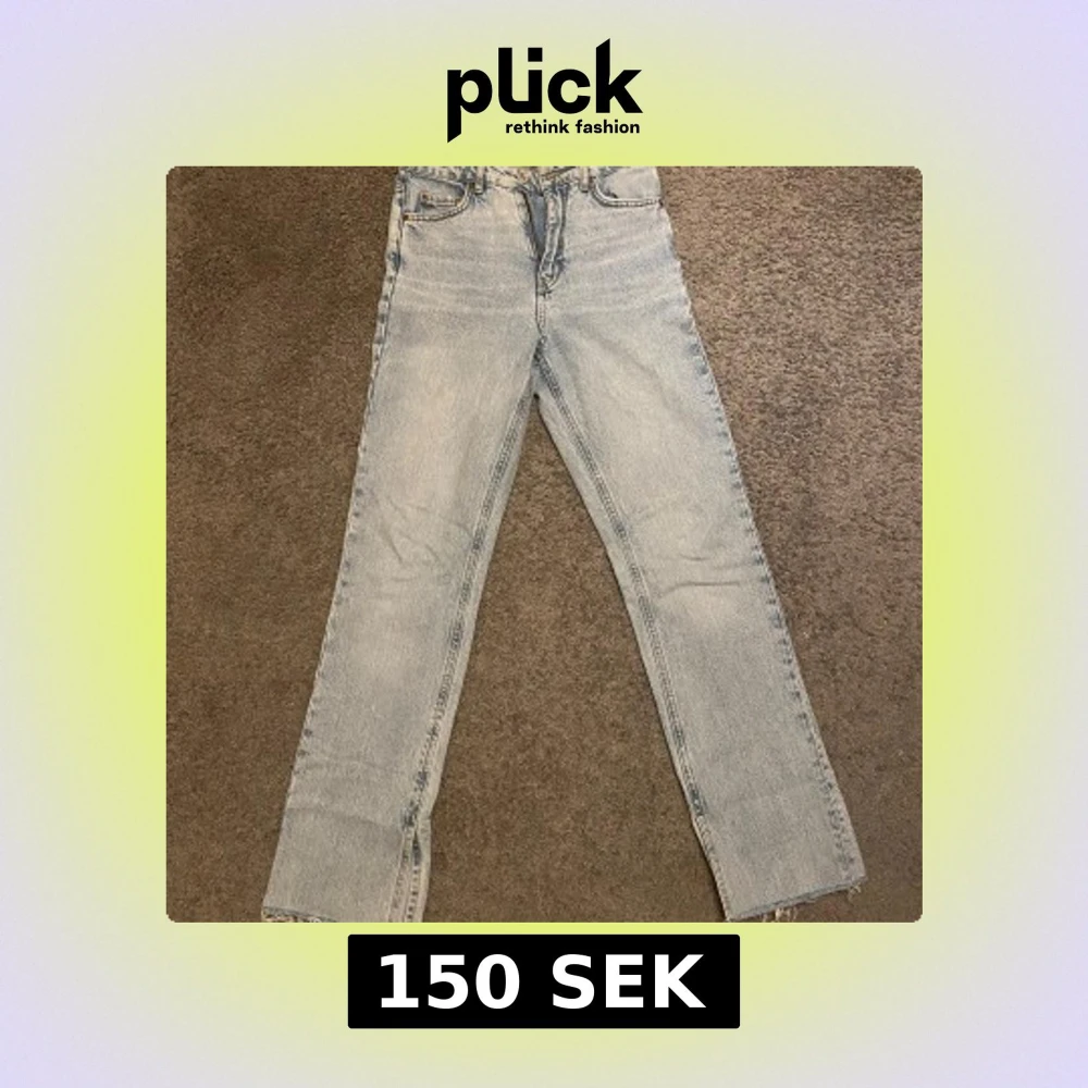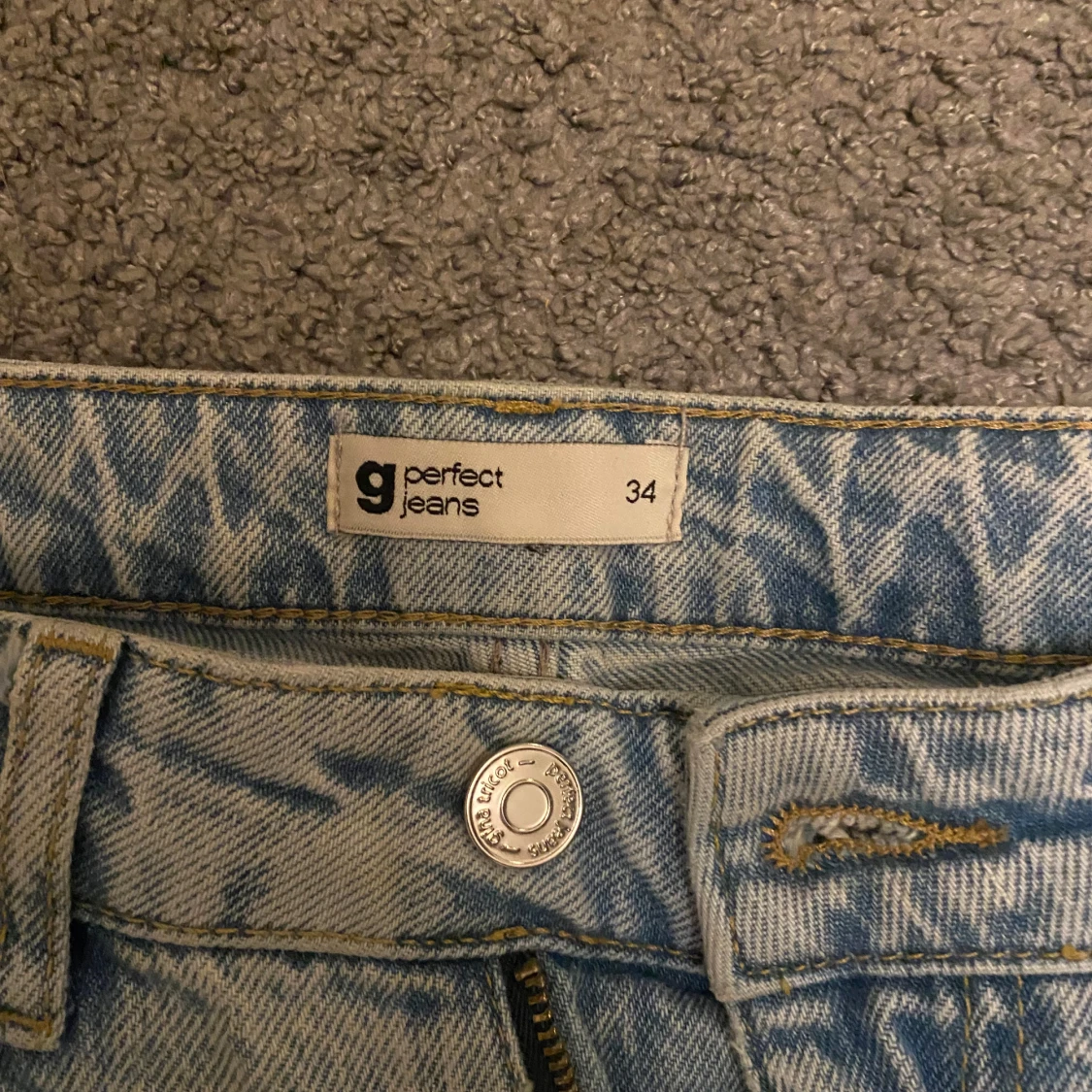 Säljer ett par ljusblå jeans från Gina Tricot. De har en klassisk design med fickor, slits vid fotändan och knappgylf. Perfekta för en avslappnad stil.