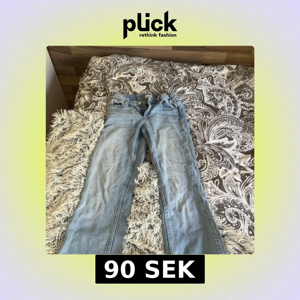 Säljer ett par ljusblå jeans från Gina Tricot i storlek 152/xxs. Klassisk femficksmodell med raka ben och normal passform. Jeansen har snygga slitningar och är tillverkade i mjukt denimtyg med bruna sömmar.