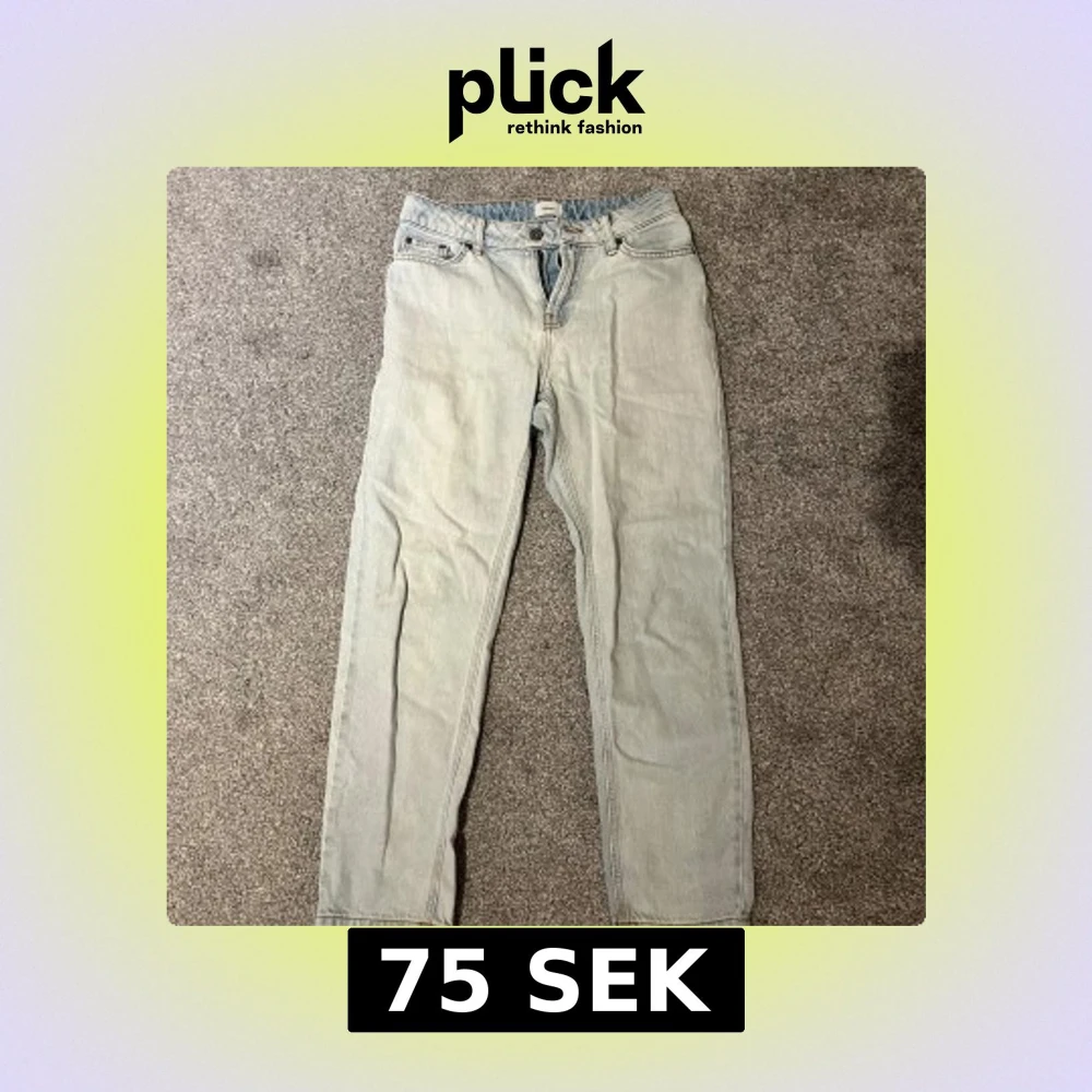 Säljer ett par ljusblå jeans från Grunt med klassisk femficksdesign och raka ben. Jeansen har orangea sömmar, bälteshällor och stängs med knapp och dragkedja. Perfekta för en avslappnad och stilren look.