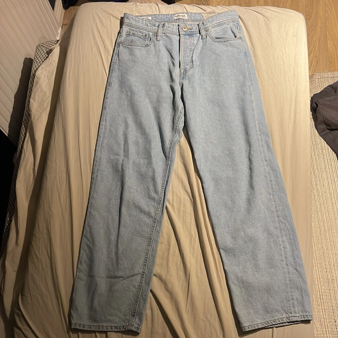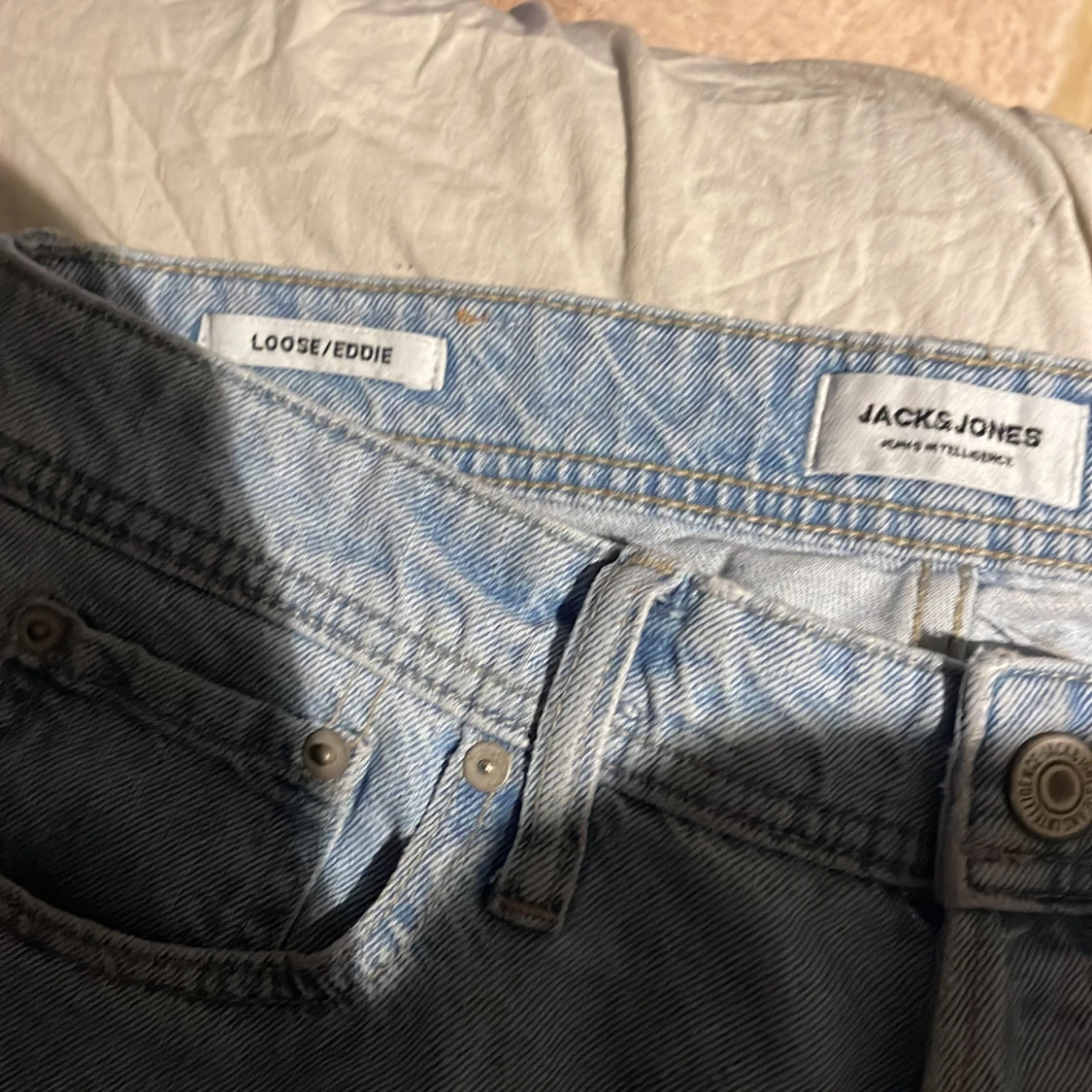 Säljer ett par ljusblå jeans från Jack & Jones i modellen Loose/Eddie. De har en avslappnad passform med klassisk femficksdesign och knappgylf. Perfekta för en casual look. Använd 1 gång. Bara att fråga ifall ni har nått att fråga om!
