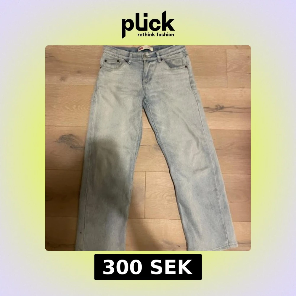Säljer ett par ljusblå jeans från Levi's med en avslappnad passform. De har en klassisk femficksdesign och knappgylf. Perfekt för en casual look.