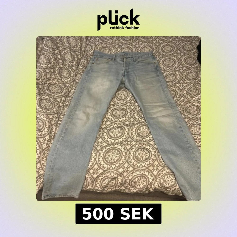 Säljer ett par klassiska ljusblå Levi's 501 jeans. De har en rak passform och är tillverkade i denim med fem fickor och knappgylf. Perfekta för en avslappnad stil.