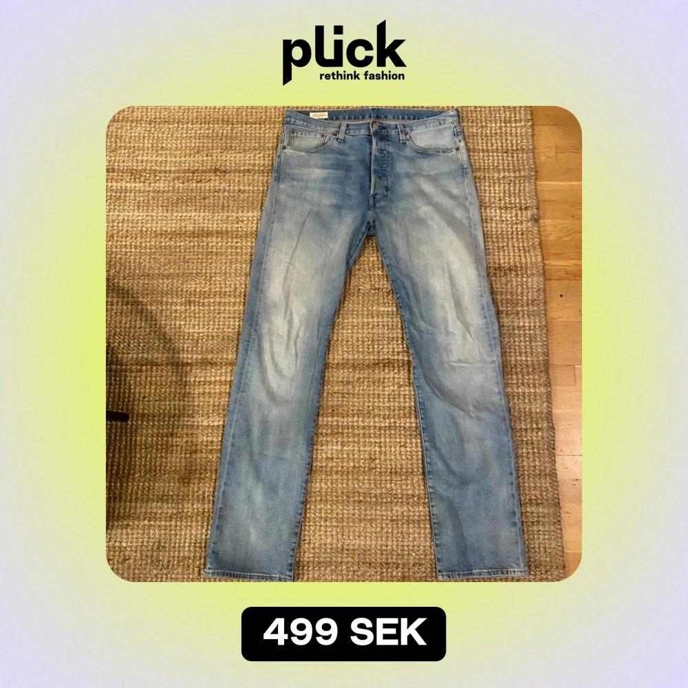 Säljer ett par ljusblå Levi's jeans i bra skick. De har en klassisk femficksdesign med knappgylf och är i en straight passform. Perfekta för vardagsbruk och kan stylas med nästan vad som helst.