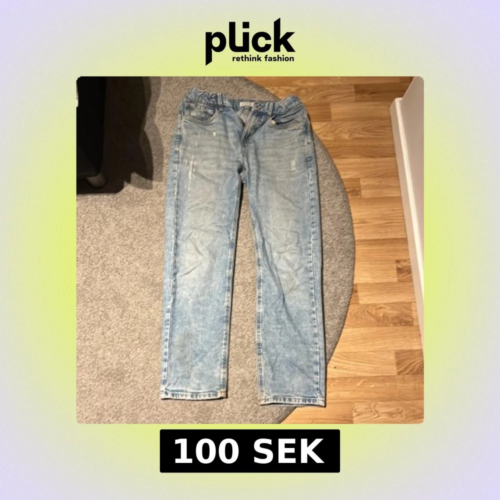Säljer ett par ljusblå jeans från Lindex. De har en klassisk femficksdesign och en rak passform. Perfekta för en avslappnad stil.