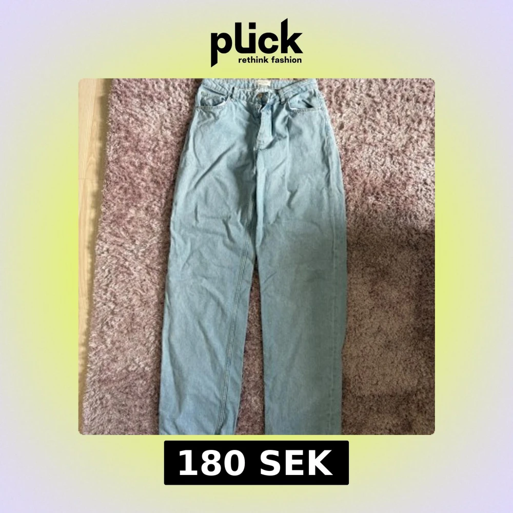 Säljer ett par ljusblå jeans från Lis Bonne Atelier med klassisk femficksdesign och guldfärgad broderad logga på fickan. Jeansen har raka ben och normal passform, tillverkade i mjukt denimtyg med silverfärgade knappar framtill.
