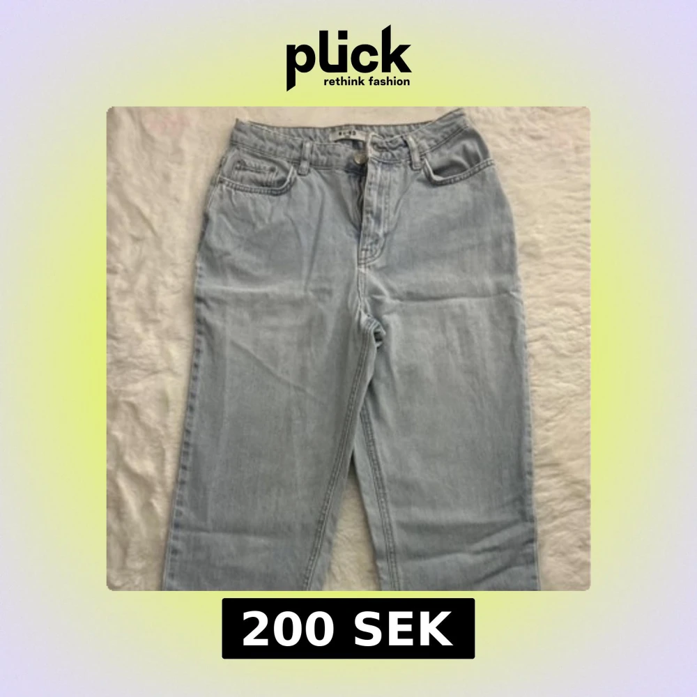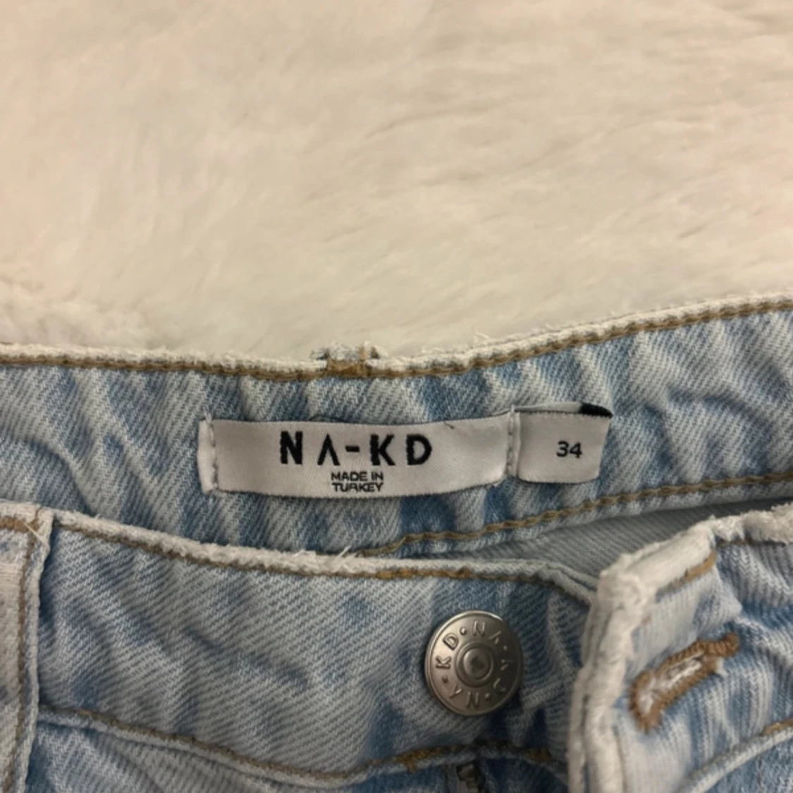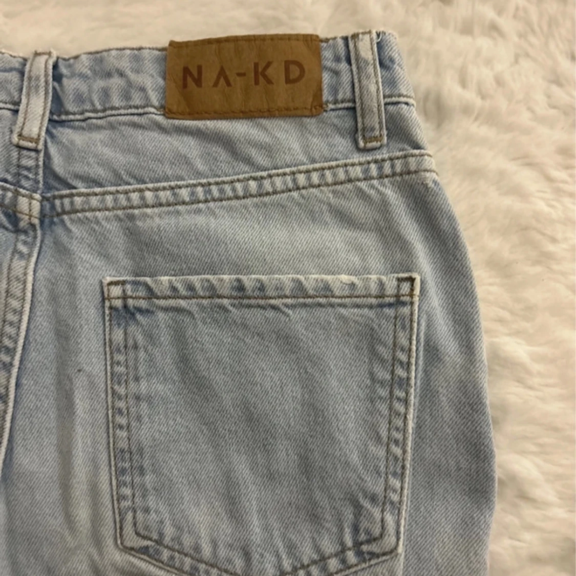 Säljer ett par ljusblå jeans från NA-KD. De har en klassisk femficksdesign och är tillverkade i ett bekvämt denimtyg. Perfekta för en avslappnad stil.