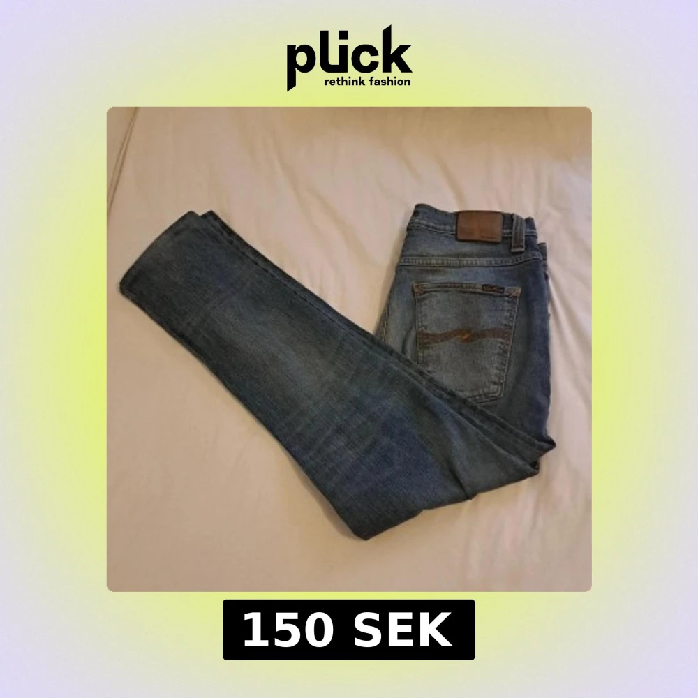 Säljer ett par ljusblå jeans från Nudie Jeans med klassisk femficksdesign och snygga kontrastsömmar. Jeansen har raka ben och subtila slitningar framtill. Bakfickorna har Nudie Jeans signaturbrodyr i orange. Perfekta för en avslappnad stil. Köpt för 500
