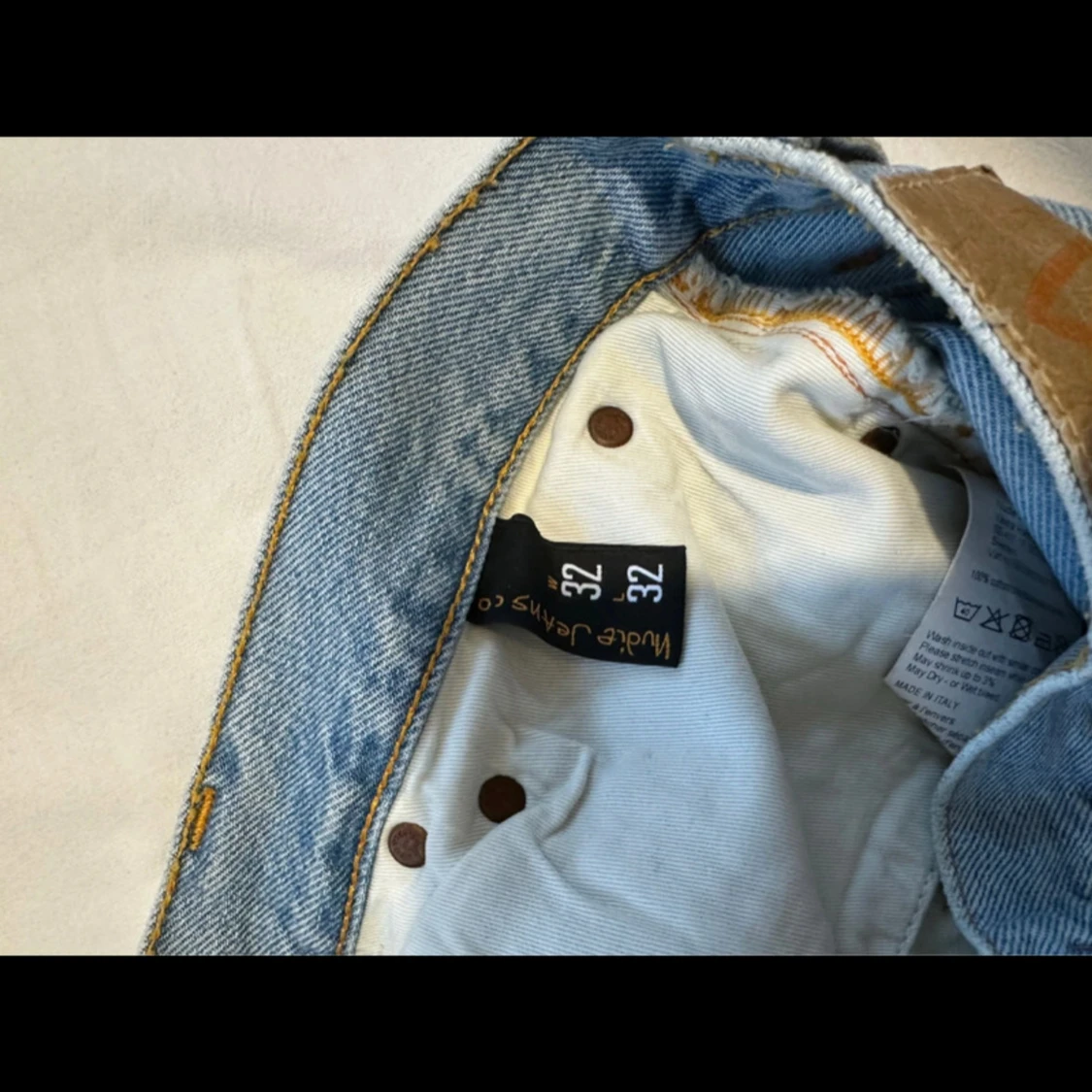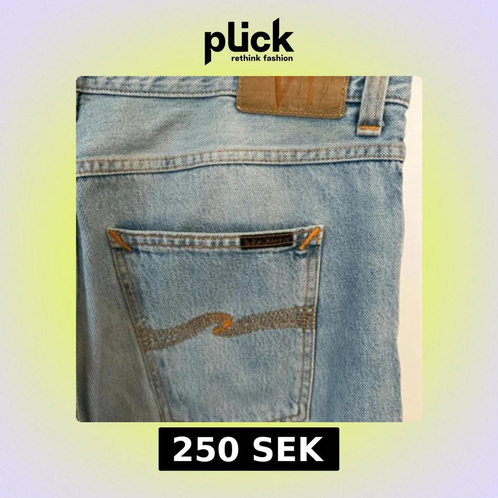 ljusblå jeans från Nudie Jeans. Jeansen har broderad bakficka och normal passform. Tillverkade i bomull och perfekta för en avslappnad stil. Modell steady eddie och har en straight passform storlek 32/32 men uppklippt någon centimeter på benet. Liten fläck på ena låret som jag inte försökt få bort men märks knappast