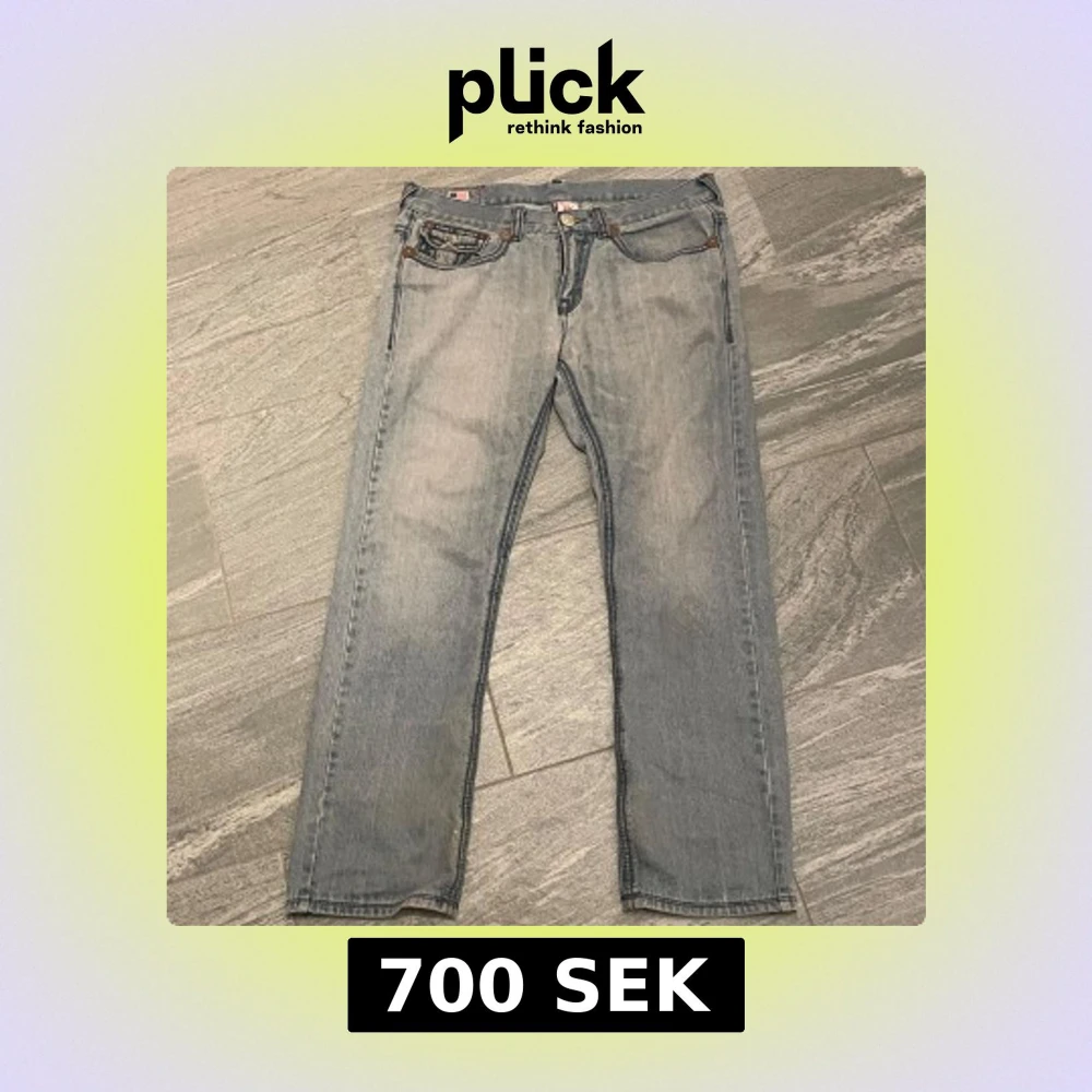 Säljer ett par ljusblå jeans från True Religion med klassiska kontrastsömmar och snygga bakfickor med broderad logga. Jeansen har raka ben och silverfärgade knappar med märkets namn. Model ”JOEY SUPER T”.