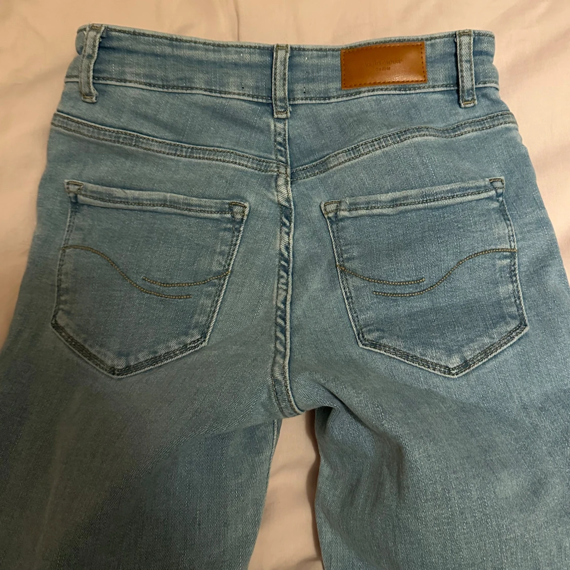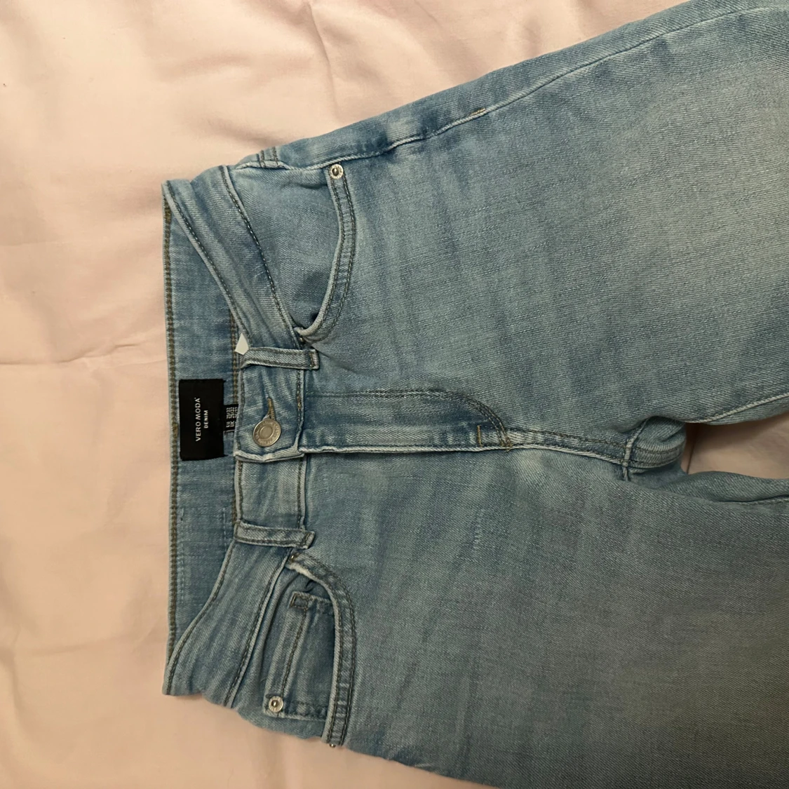 Sköna och stretchiga ljusblåa jeans från Vero Moda. Nästantill nya men finns inte kvar på hemsidan. Ska vara low waist men skulle säga mellan low waist och mod waist. Storlek 25/32 och bootcut.