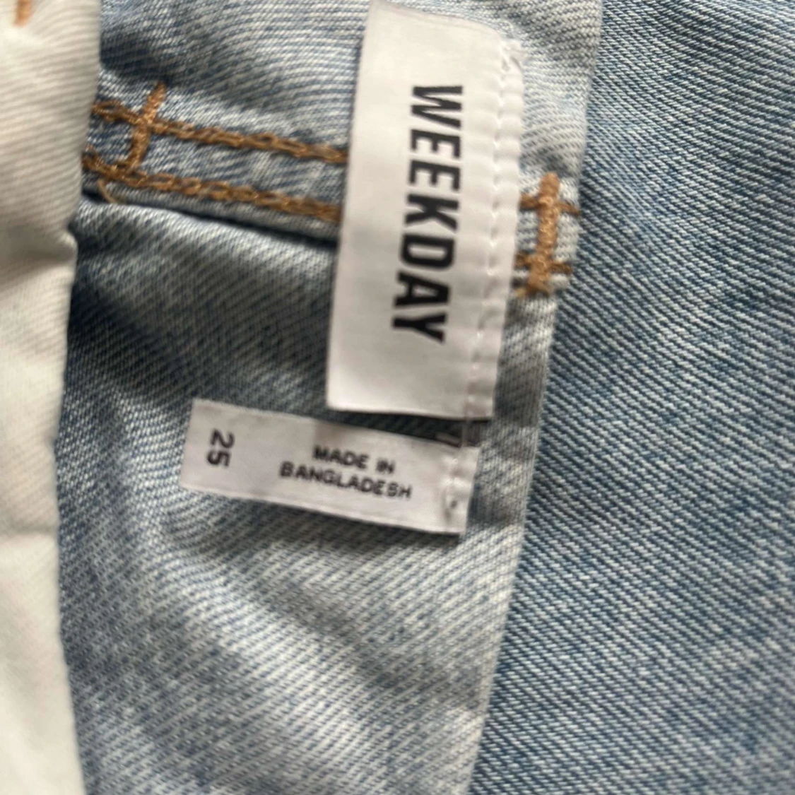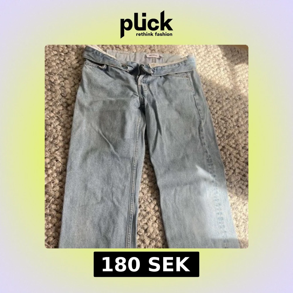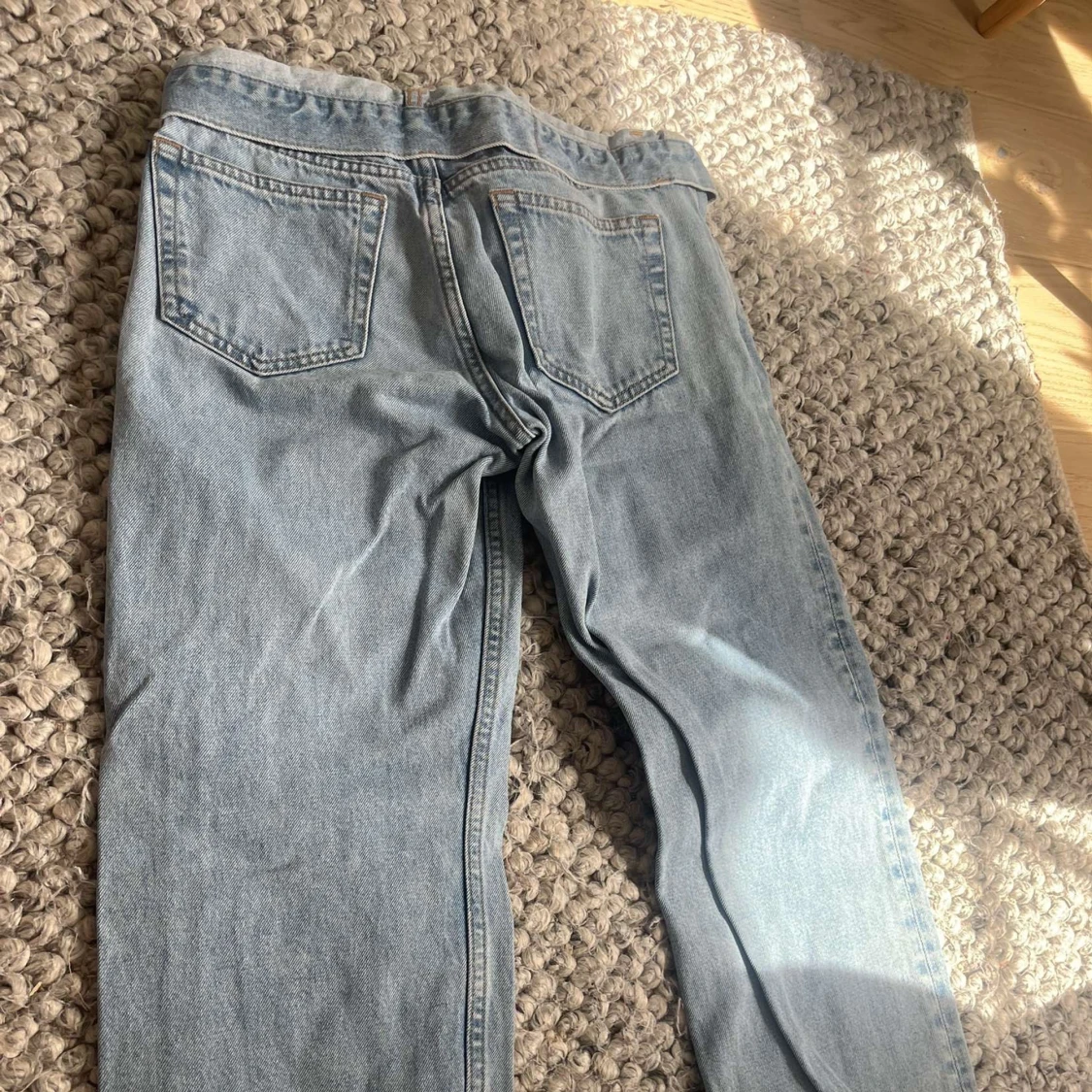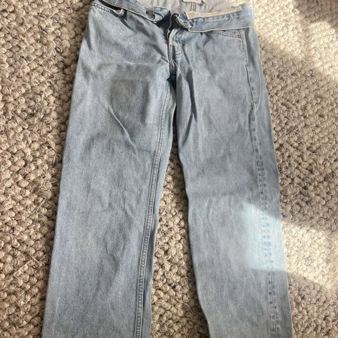 Säljer ett par ljusblå jeans från Weekday med klassisk femficksdesign och raka ben. Jeansen har normal passform och stängs med dragkedja och knapp. Perfekta för en avslappnad stil. De är även lågmidjade