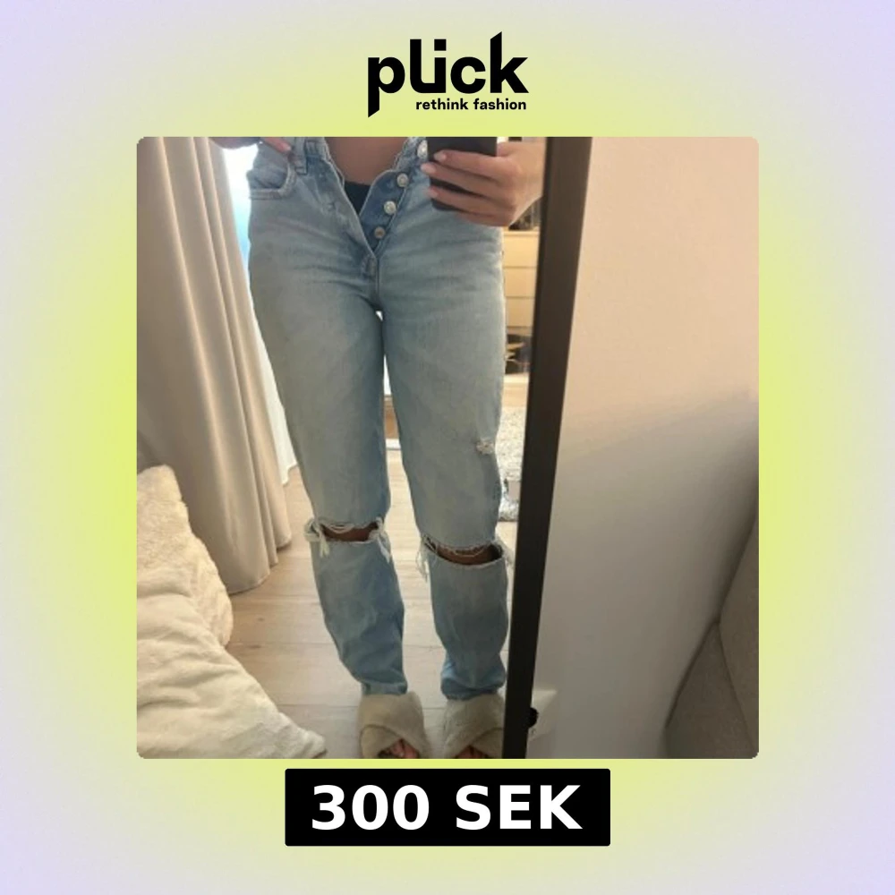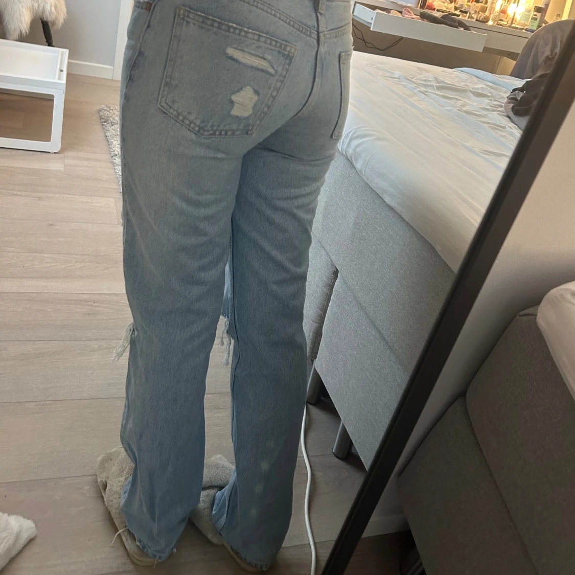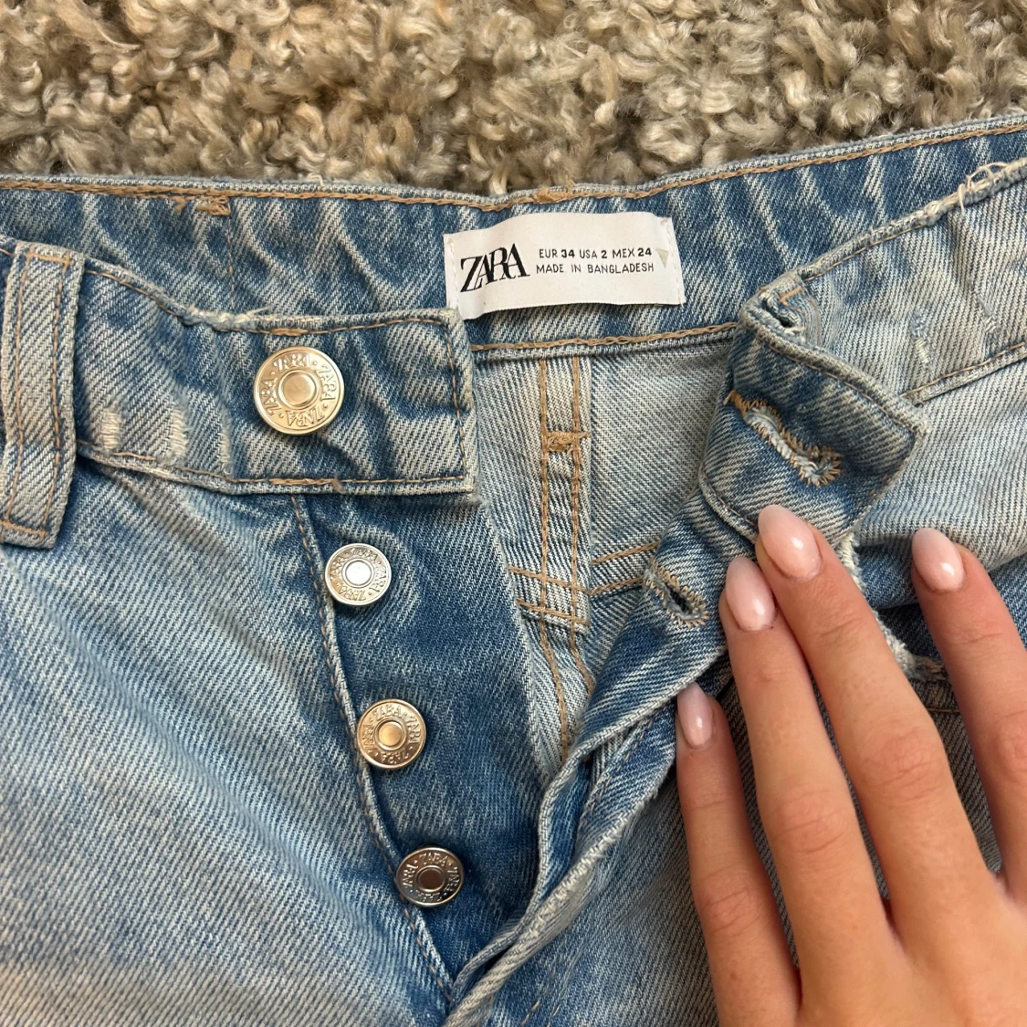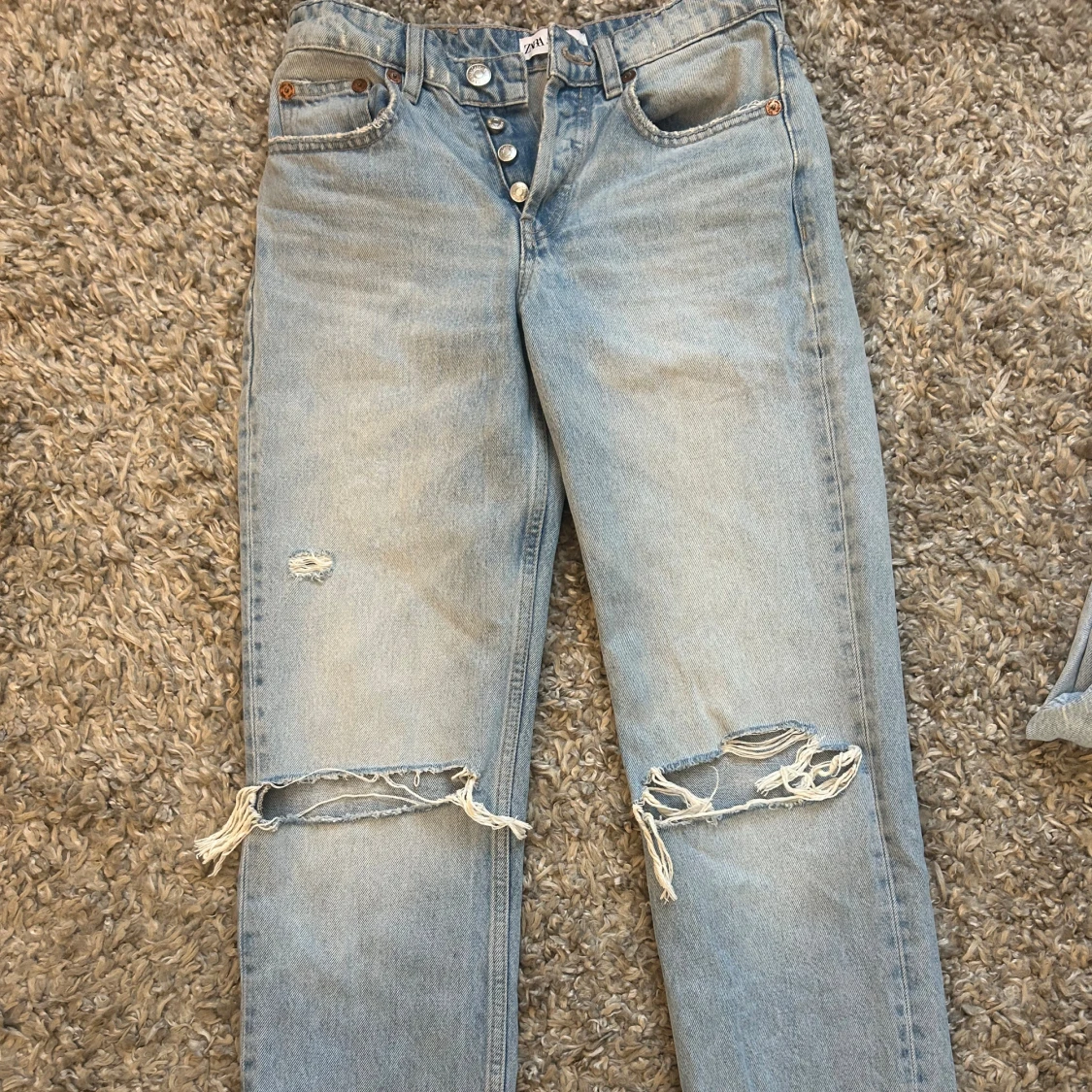Säljer ett par ljusblå jeans från Zara med raka ben och slitna detaljer vid knäna. Byxorna har medelhög midja, knäppning med fyra silverfärgade knappar och klassisk femficksdesign. Så så fina men tyvärr för små för mig!🩷