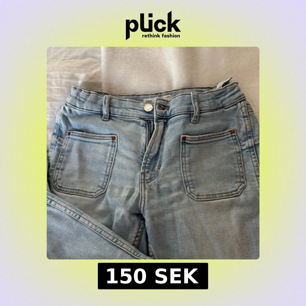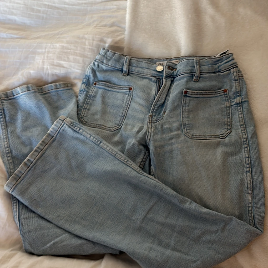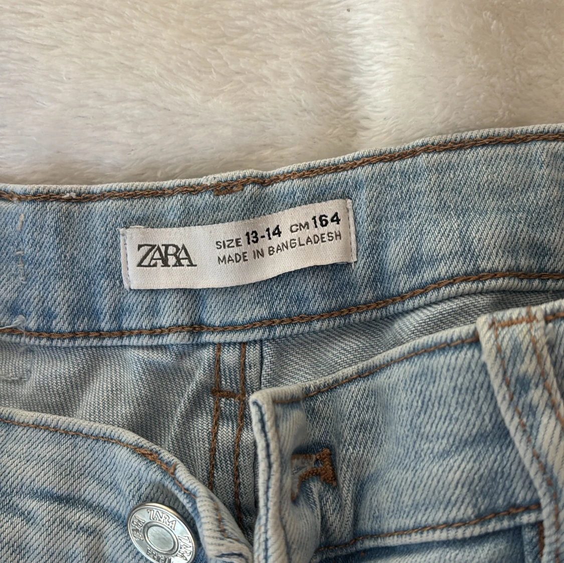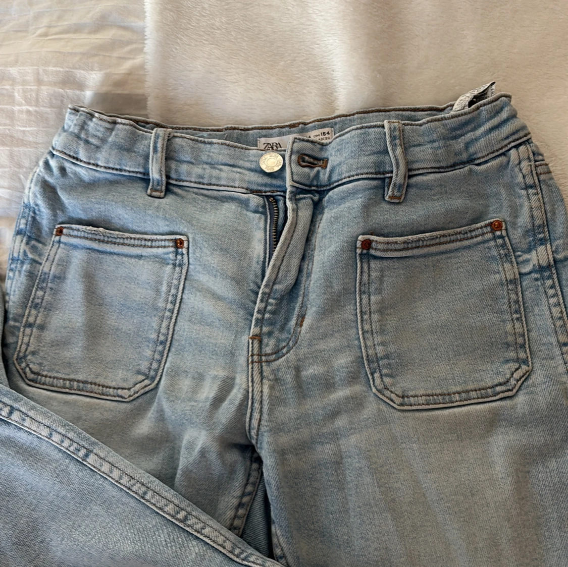 Snygga ljusblå jeans från Zara i storlek 13-14 år. De har en klassisk femficksdesign med dragkedja och knapp framtill. Perfekta för en avslappnad stil. Bootcut