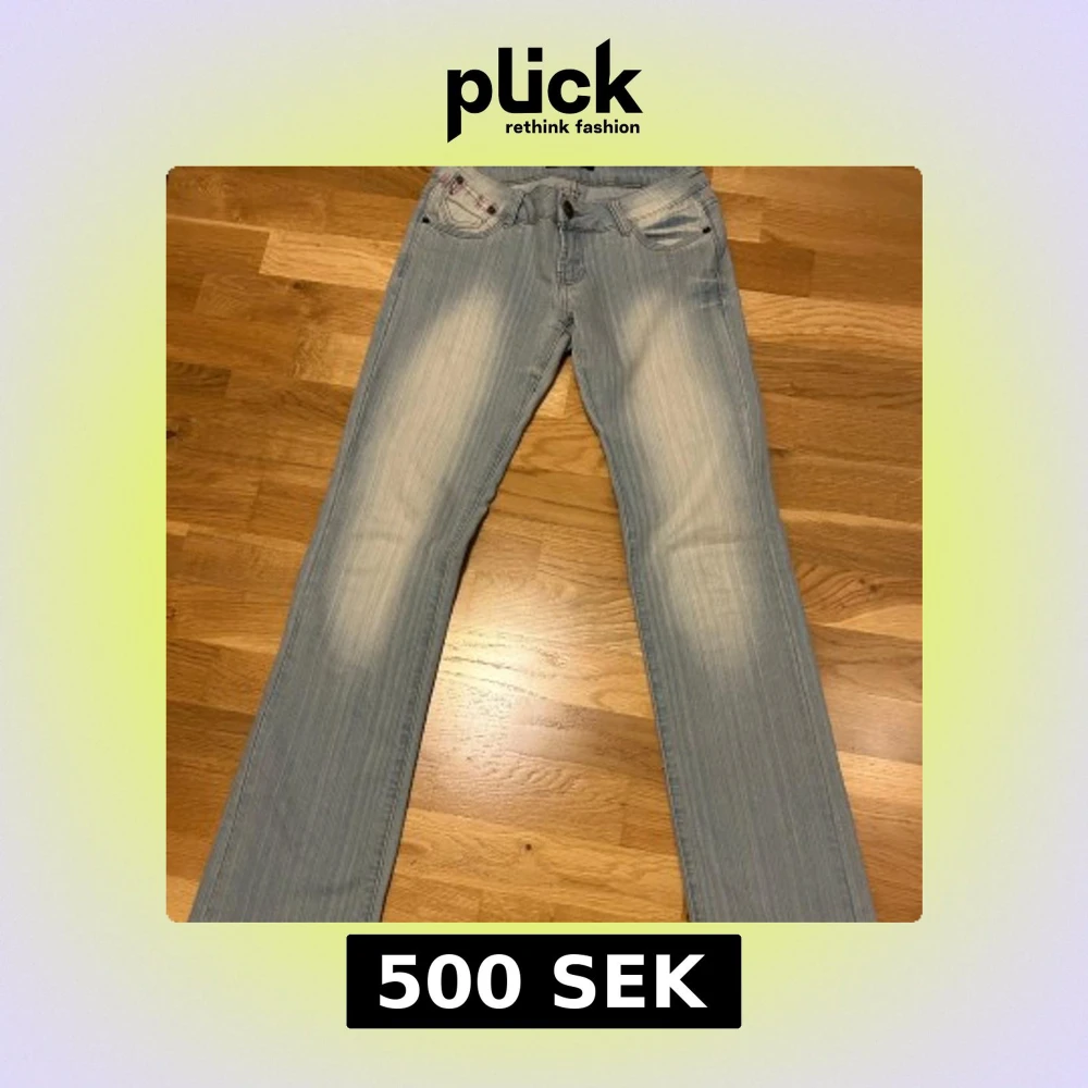 Snygga ljusblå Bestyled jeans med en broderad detalj på bakfickan. Mycket låg midja. Storlek XS. Midjemått 35 cm rakt över. Innerbenslängd 82 cm. Det är dessa bilder jag har.