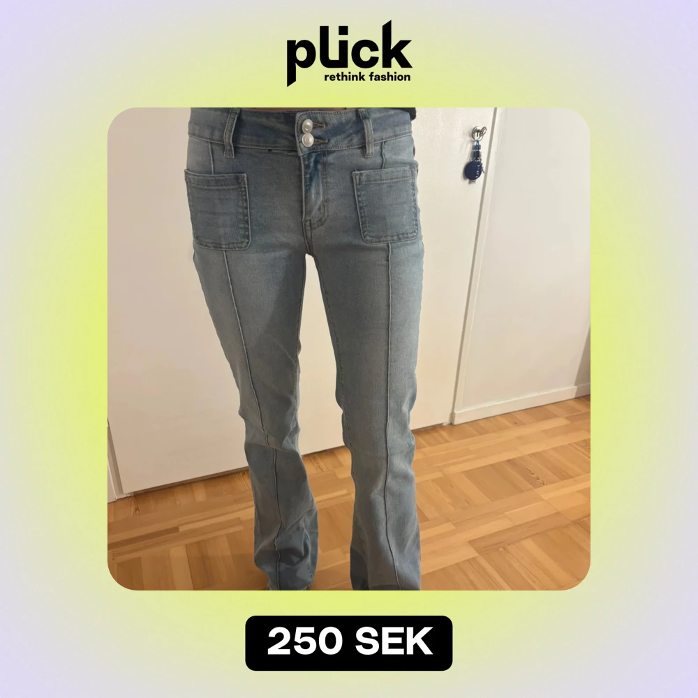 Säljer ett par ljusblå jeans i bra skick. De är lågmidjade med en bootcut-stil och har stora framfickor samt bakfickor med knappar. Perfekta för både vardag och fest! 🦋