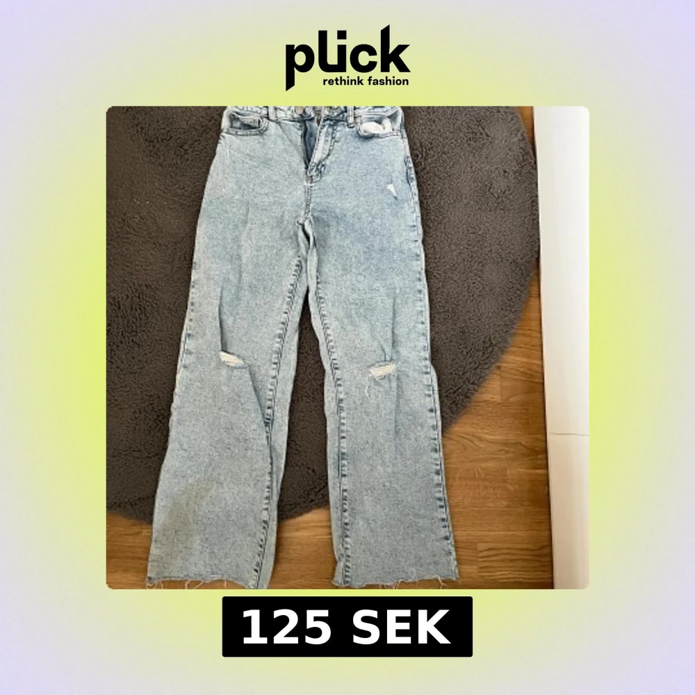 Säljer ett par ljusblå jeans med hög midja och loose fit. De har slitna detaljer på knäna och råa kanter vid bensluten för en trendig look. Perfekta för en avslappnad stil. Priset går att diskutera och om du vill ha fler bilder är det bara att säga till!
