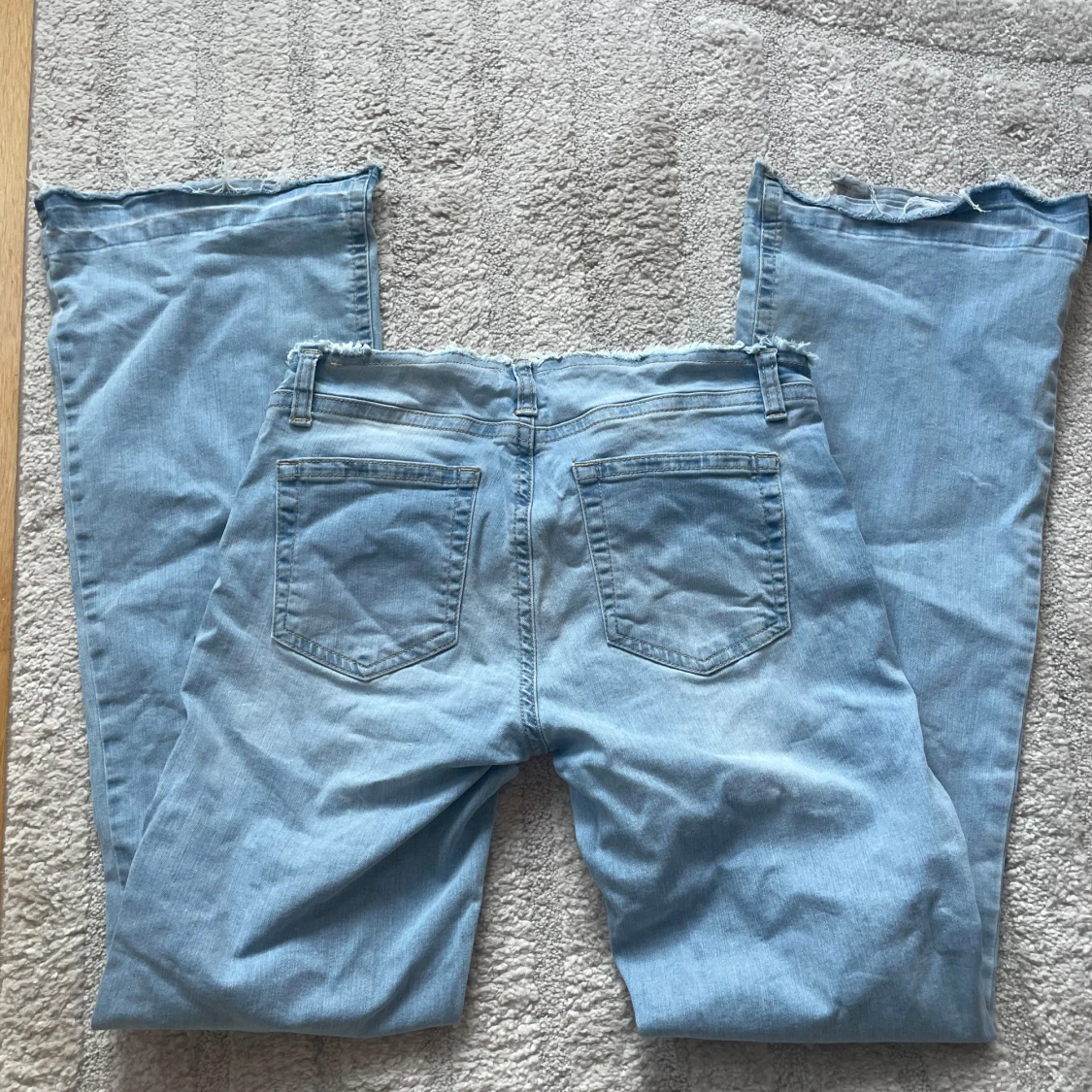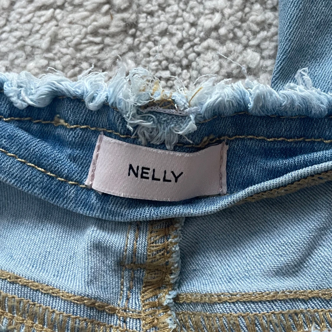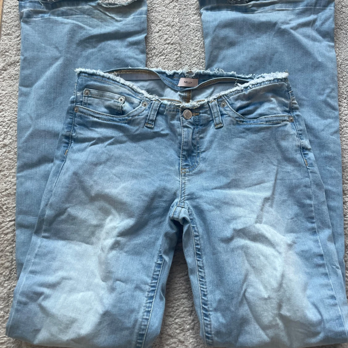 Säljer ett par ljusblå jeans från Nelly med fransad kant i midjan och vid benslut. Jeansen har klassisk femficksdesign, i bootcut och normal passform.