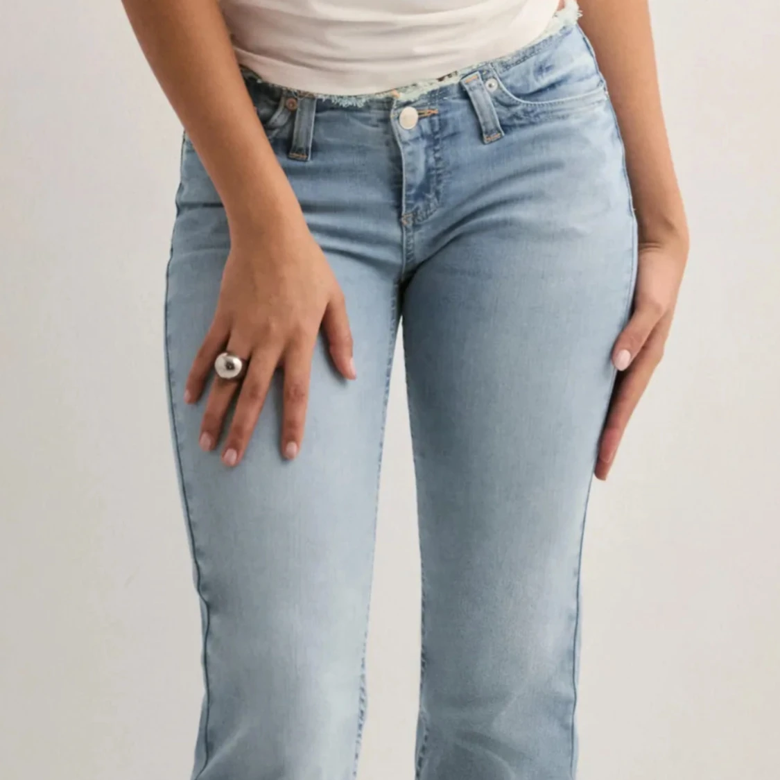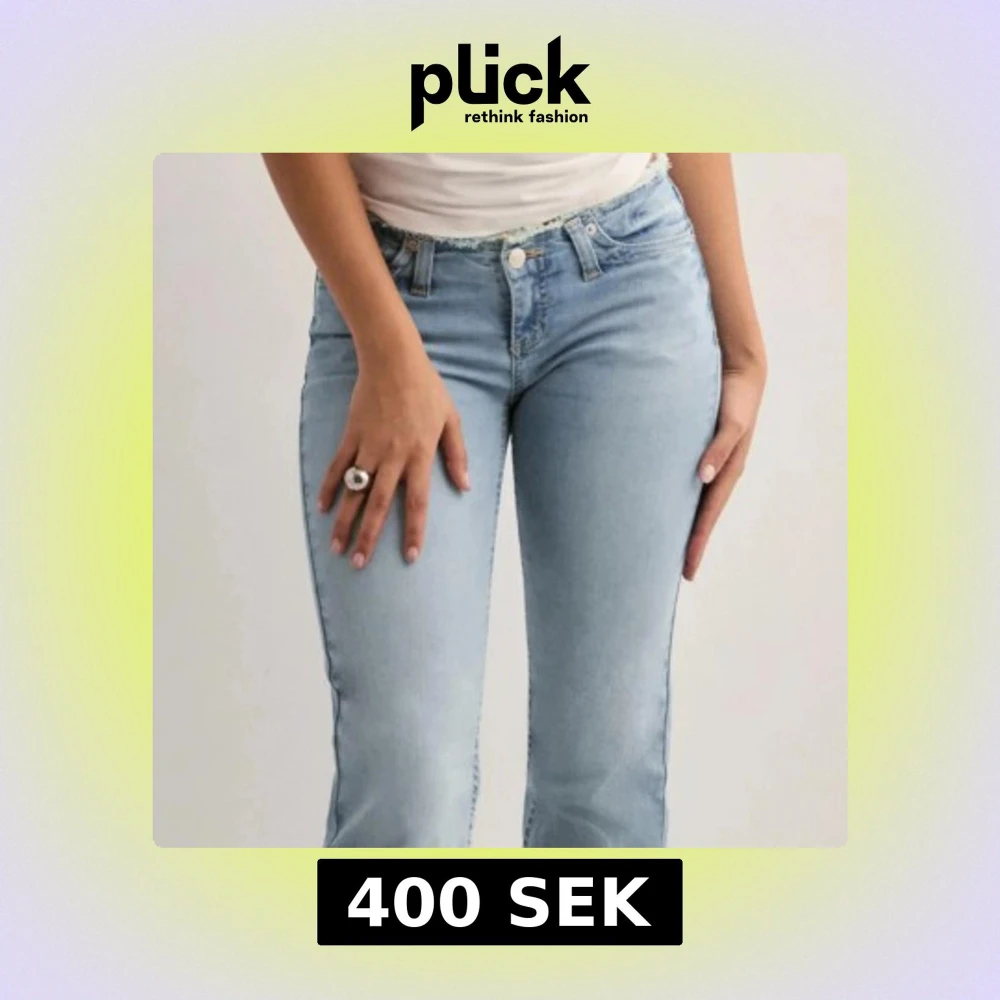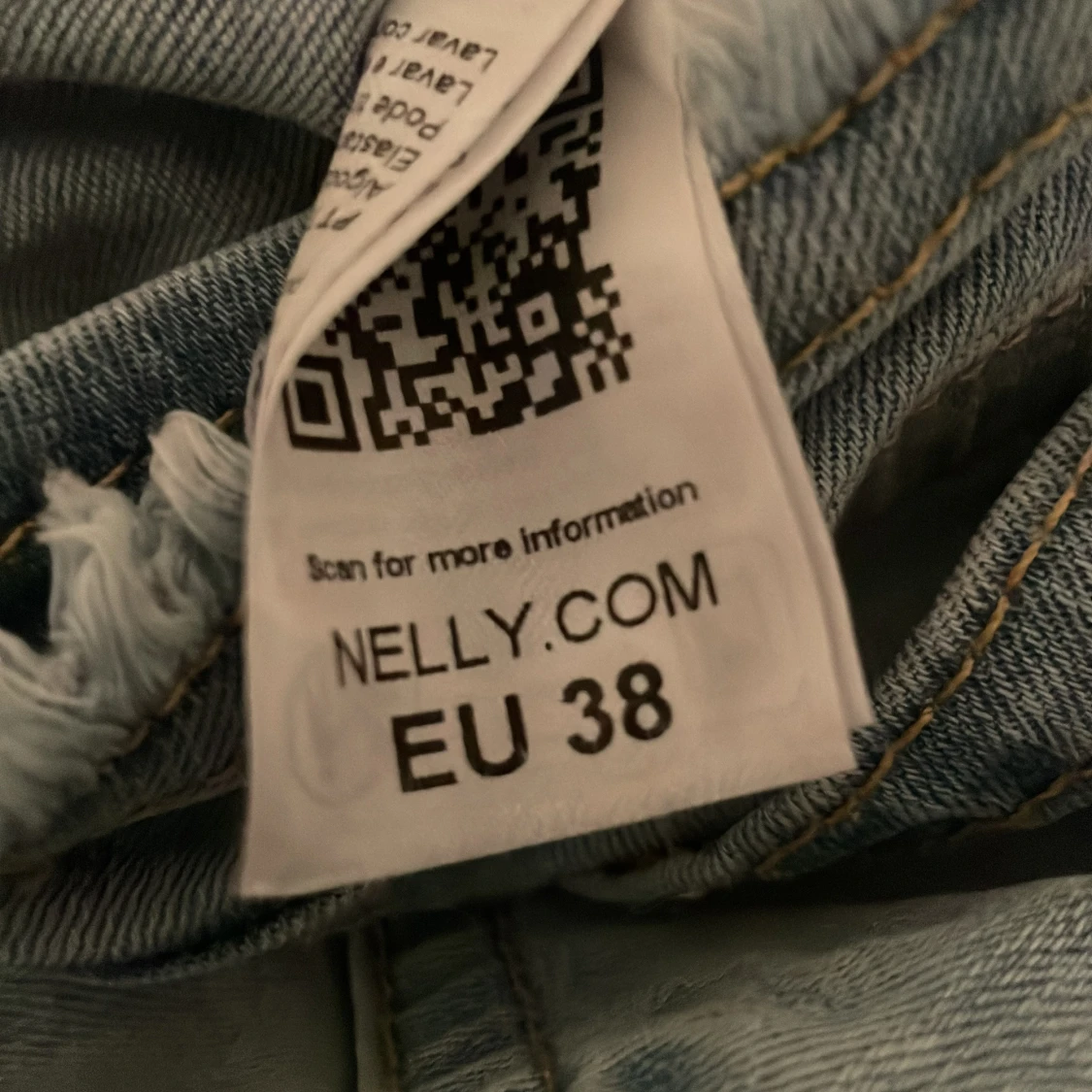 Säljer ett par ljusblå jeans från Nelly med fransad kant i midjan och vid benslut. Jeansen har klassisk femficksdesign, i bootcut och normal passform.