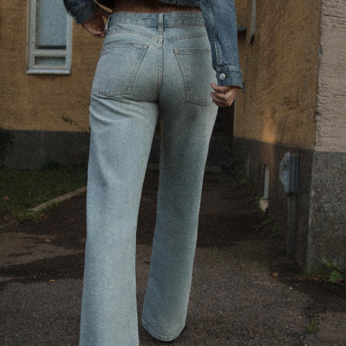 Snygga ljusblå jeans med rak passform och klassisk femficksdesign. Helt slutsålda från Zaras hemsida, midwaist med wide leg🤗