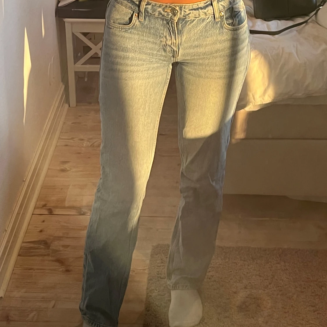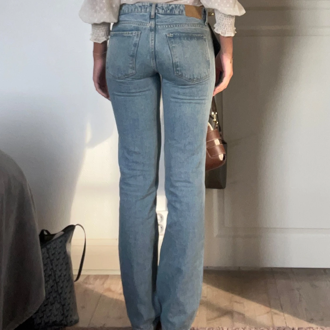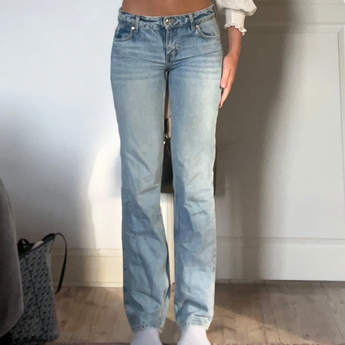 Snygga blå jeans som är som nya! Perfekt nu till våren🙌🏻🌸 De är lågmidjade från zara! Använt dem ett par få gånger men säljer då de är för små!
