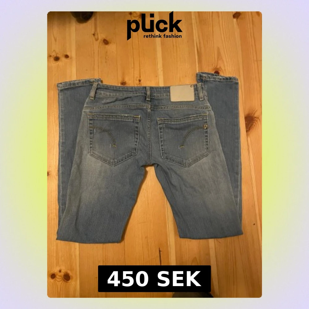 Säljer ett par ljusblå jeans med klassisk design och raka ben. Jeansen har snygga detaljer på bakfickorna och en neutral patch bak i midjan. Perfekta för dig som gillar en enkel och stilren look.