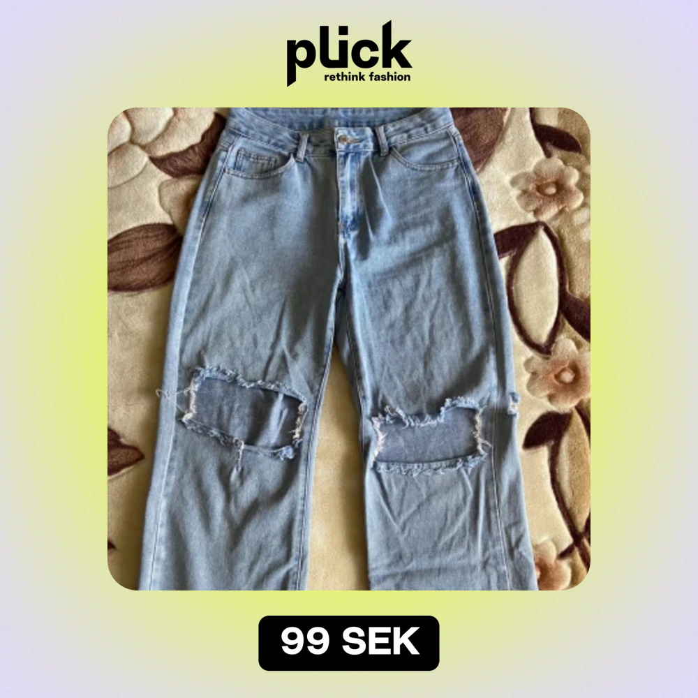 Snygga jeans från shein! Bra kvalitet trots märket. Ingen stretch. Fanns en ”spricka” längs höger knä - ihopsytt (bild 3). Annars felfritt. Fungerande dragkedja, hela byxfickor. Raka ben, hög midja. Stl. Petite M (38) Nypris: 159 kr