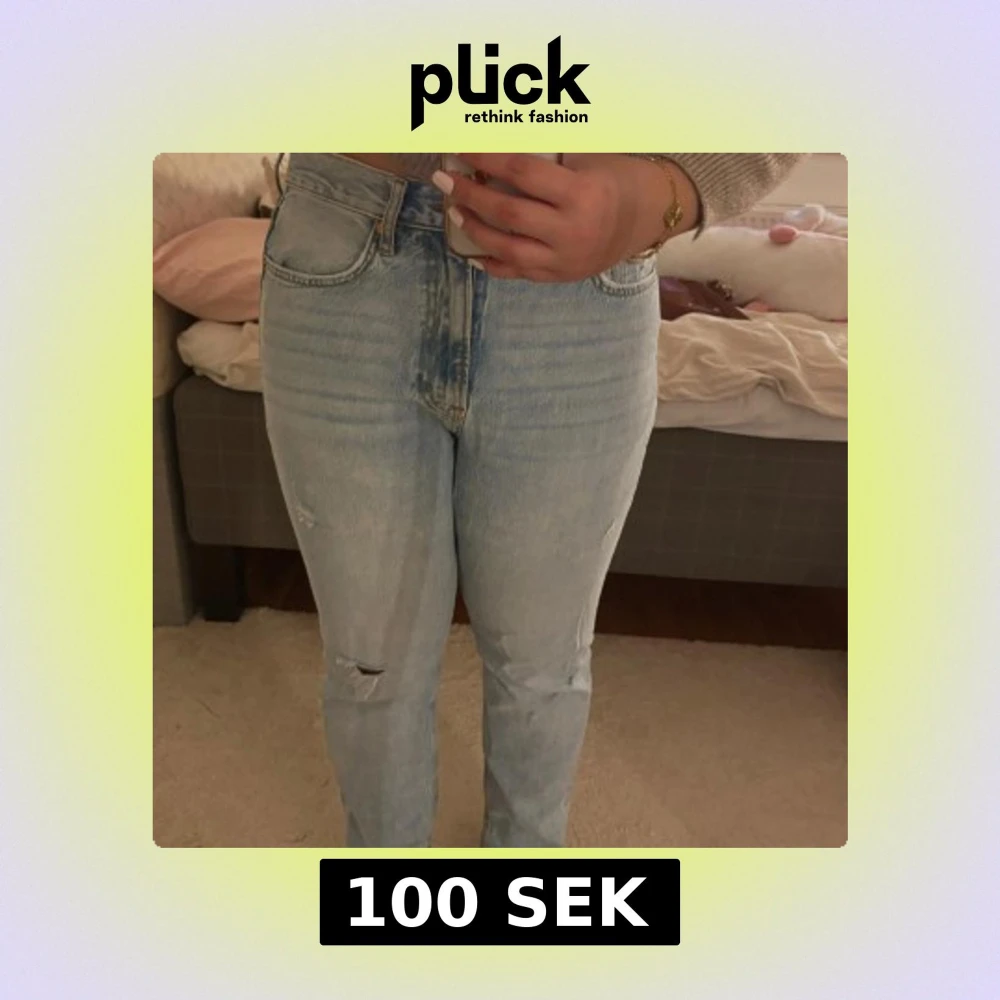 Snygga ljusblå jeans med en liten slitning på ena benet. De har en klassisk femficksdesign och hög midja. Perfekta för en avslappnad stil.