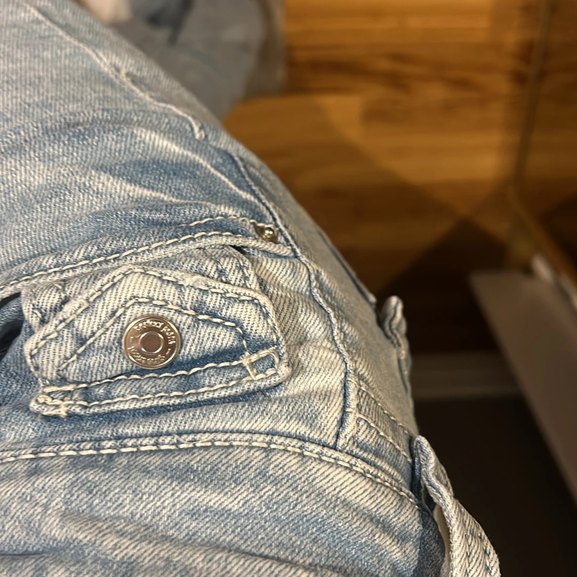 Snygga ljusblĂ„ jeans med slitningar pĂ„ knĂ€na och coola fickdetaljer. De har en bootcut-stil och Ă€r lĂ„gmidjade, vilket ger en avslappnad look. Perfekta för en trendig vardagsstil.dom Ă€r frĂ„n ginas barnavdelning men passar mig som har xs i byxor och jag Ă€r 160-165 cm och passar mig perfektđ