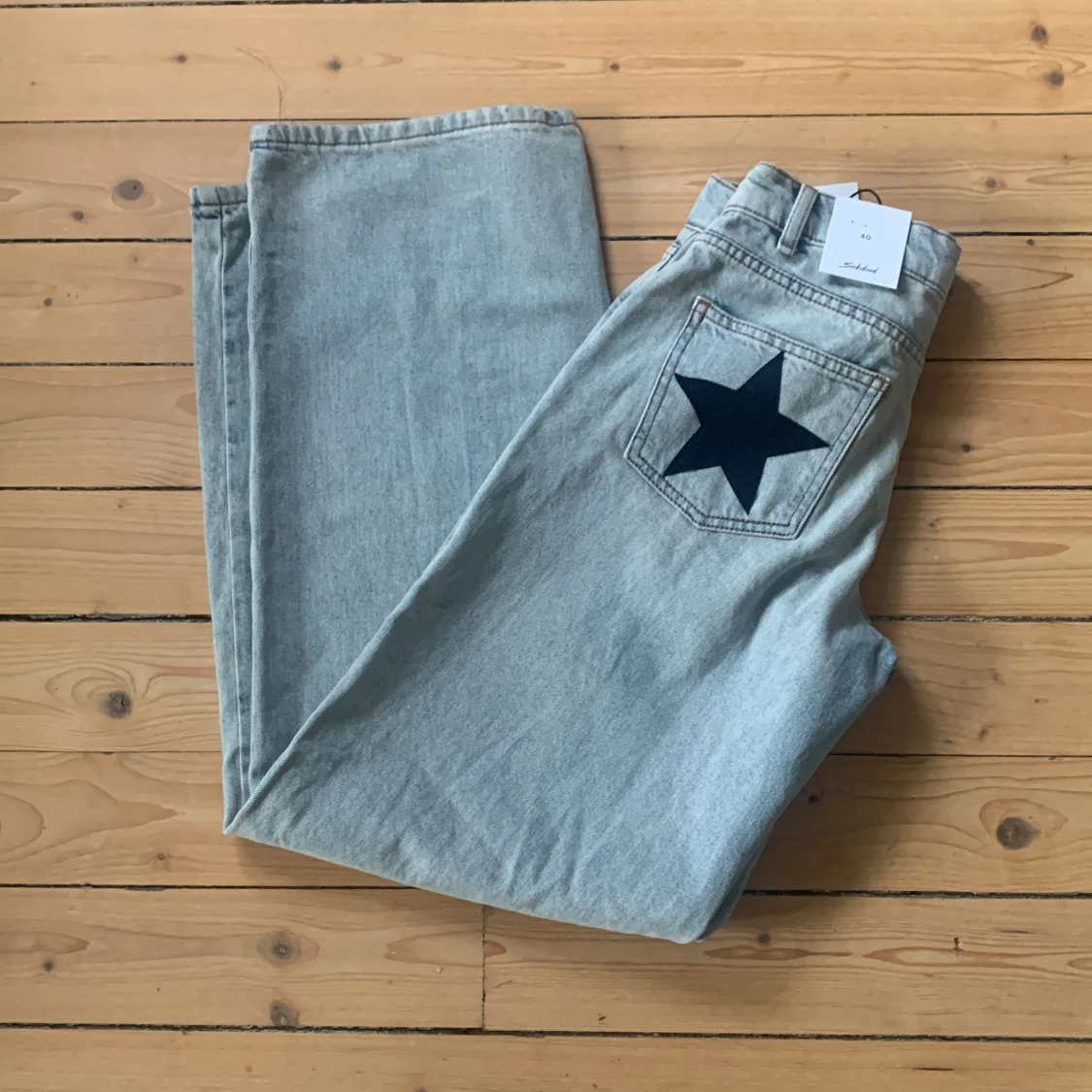 Ljusblå raka jeans från Subdued med coola svarta stjärnor på bakfickorna. Jeansen har normal midja, klassisk femficksdesign och är tillverkade i bomullsdenim. Aldrig använda, säljer pågrund av förlusten storlek. Nypris 900kr.