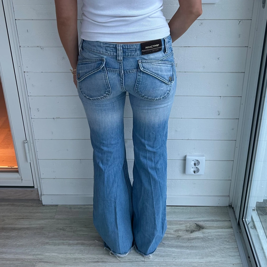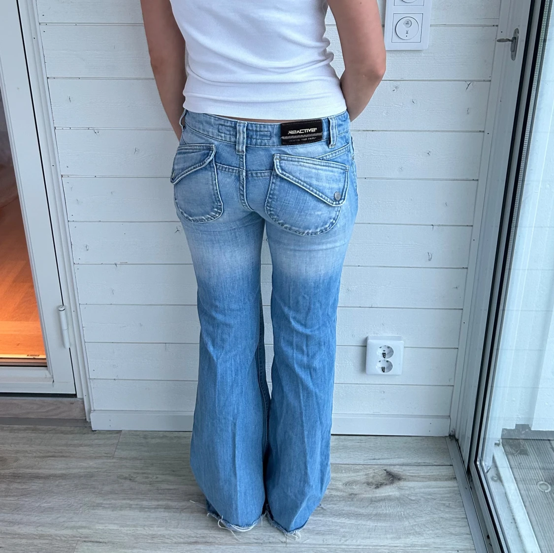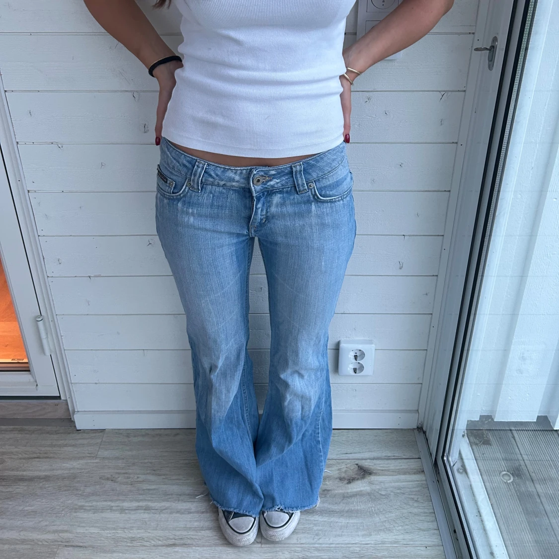 Ljusblå utsvängda jeans i storlek XS. Midja: 36x2 cm innerben: 79 cm