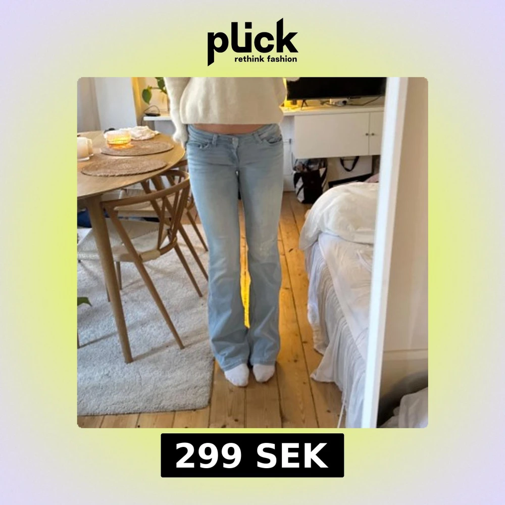 Säljer ett par ljusblå Lågmidjade bootcut jeans medklassisk femficksdesign och snyggt broderad detalj i rött på bakfickorna. Strl s, midjemått ca 36cm och innebenslängden ca 80cm. Jeansen har låg midja och är tillverkade i mjukt jeanstyg som sitter skönt och ger en cool siluett. Liten söm/tråd som har gått upp på bakfickan som man ser på näst sista bilden, inget trasigt så eller något som stör/syns