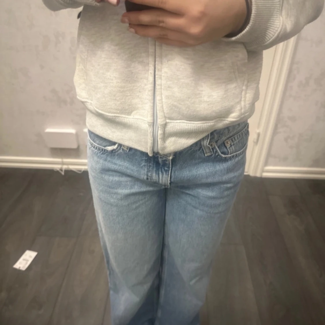 Säljer ett par ljusblå jeans med en klassisk femficksdesign. De har en rak passform och är högmidjade, vilket ger en bekväm och stilren look. Perfekta för en avslappnad stil.