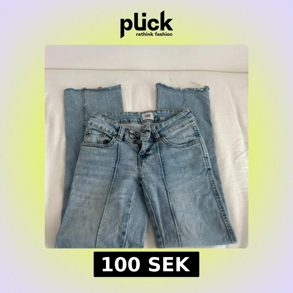 Säljer ett par ljusblå lågmidjade utsvängda jeans från 157 Paris med raka ben och råa, avklippta benslut. Klassisk femficksmodell med hög midja och snygga söm-detaljer framtill. Perfekta för en avslappnad och trendig look.