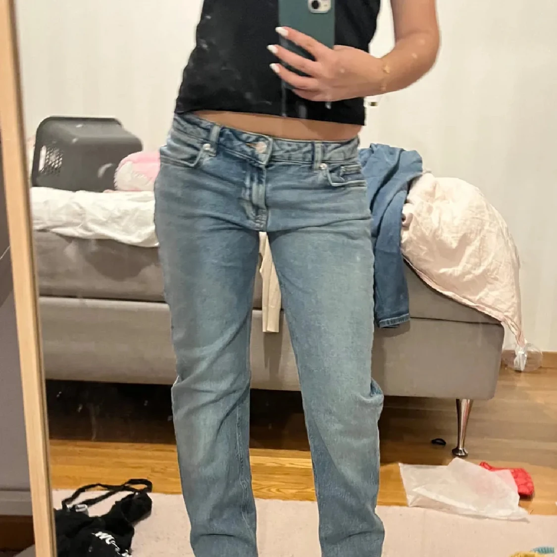 Snygga ljusblå jeans med en klassisk straight passform. Haft på mig tre gånger då jag köpte fel storlek. De har sytts upp så att de passar mig som är 163. Kan gå ner i pris